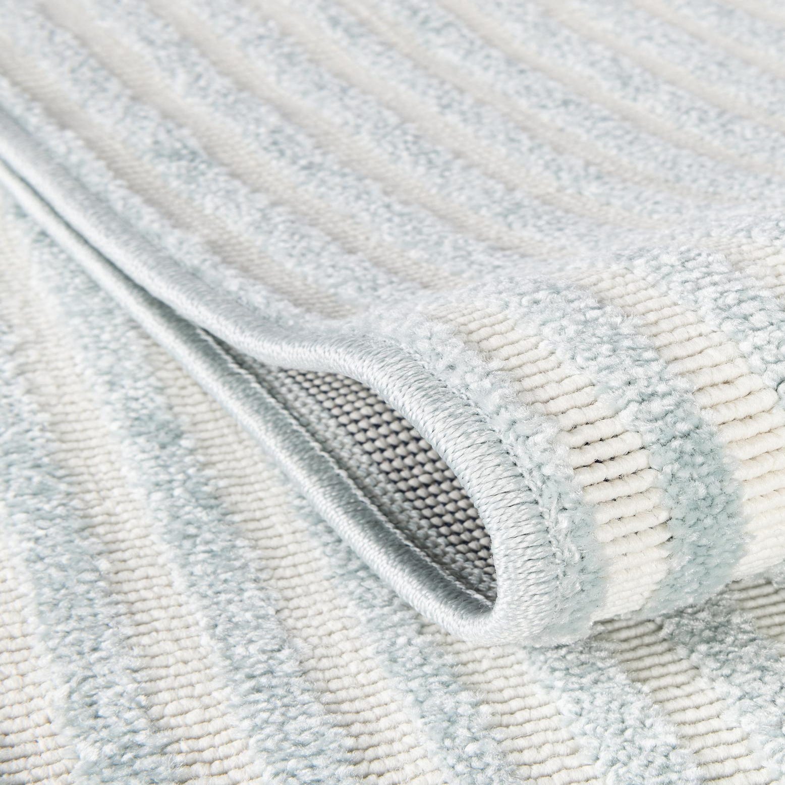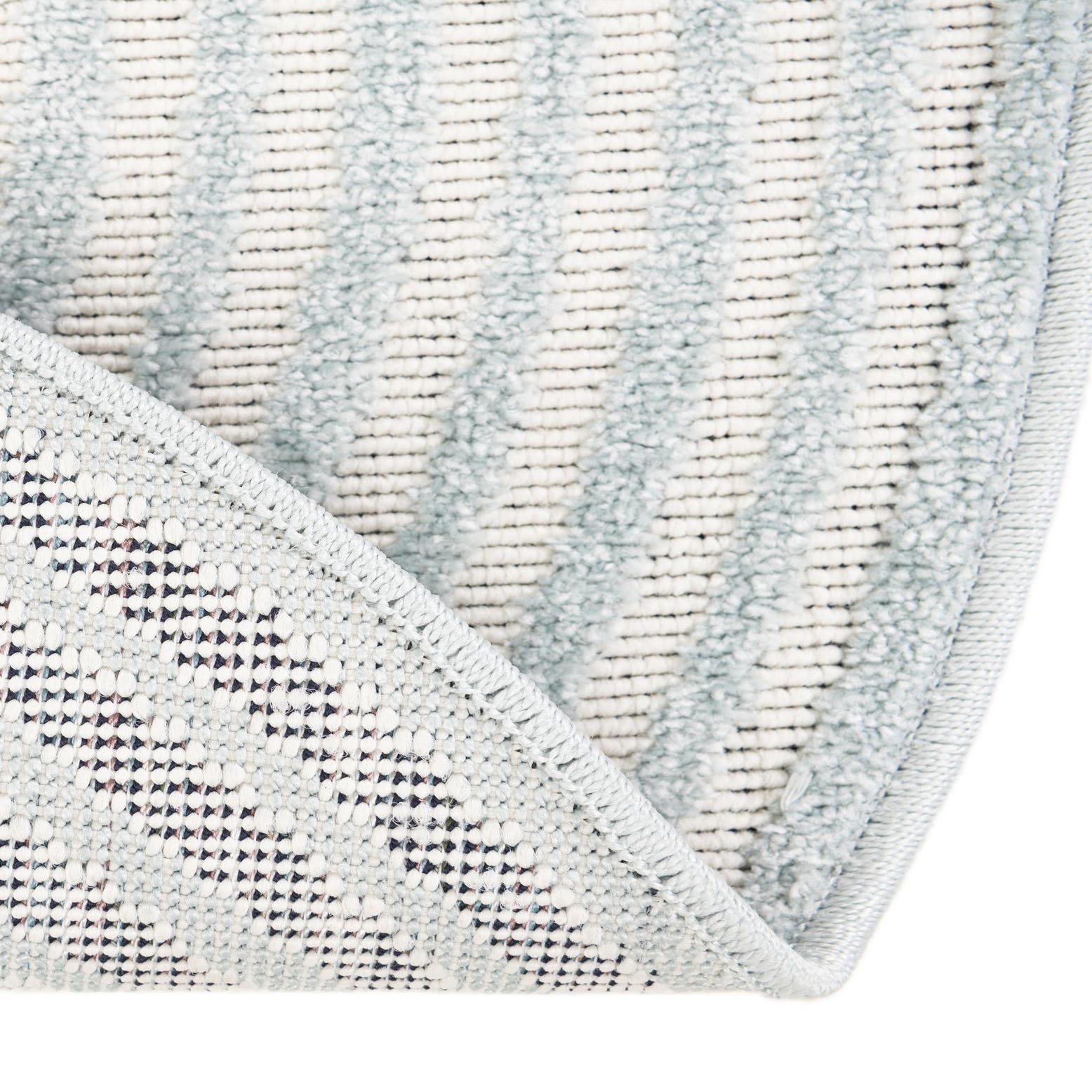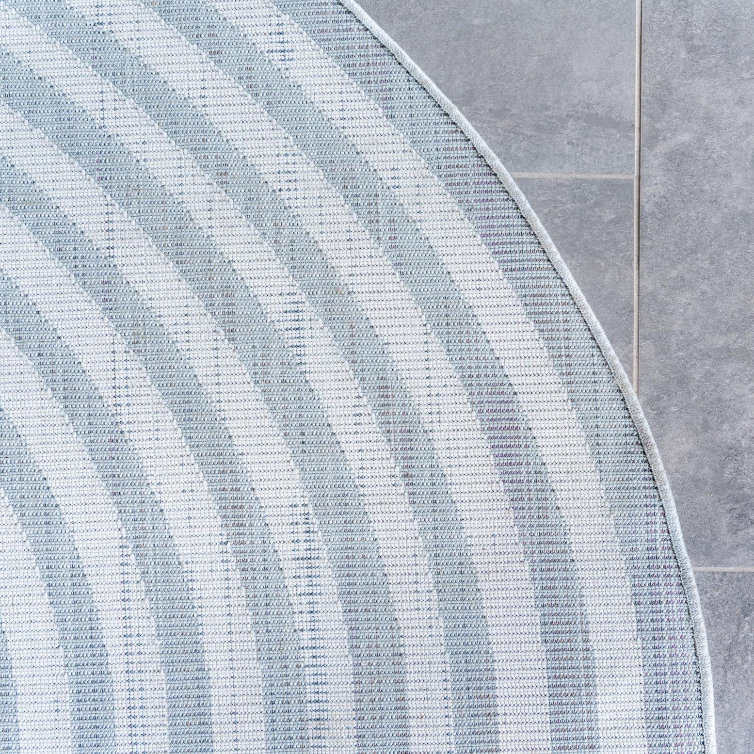 A light blue and white round rug with a modern striped pattern, suitable for indoor or outdoor use.