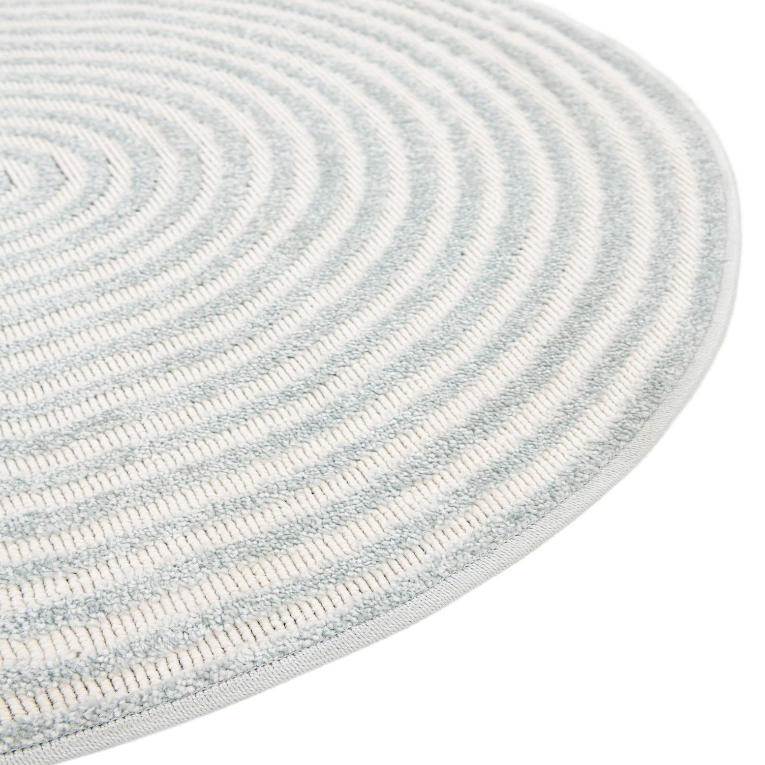 A concentric-ring pattern unfolds from the center in alternating bands of light blue and ivory, creating a calm, geometric look. The background is light blue, with ivory ribs that add subtle contrast and movement. Machine-made from 100% polypropylene, the rug has a low-profile, tightly woven surface with a gently ribbed texture you can feel underfoot—soft enough for bare feet yet structured enough to hold its shape.