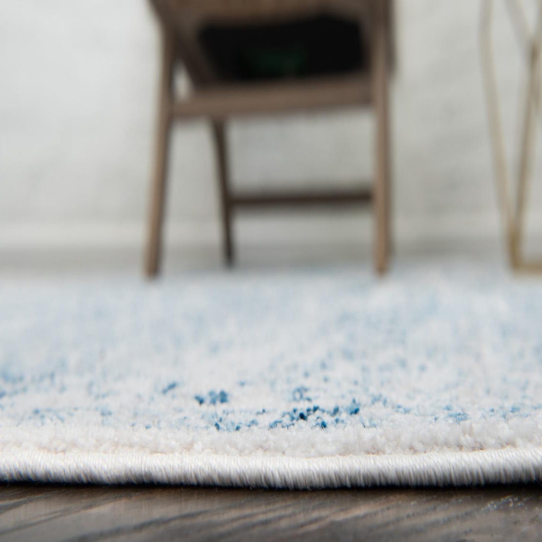 The round shape and airy palette make this piece well suited to coastal, cottage, or casual contemporary settings. Place it beneath a small bistro table, in a sunlit bedroom, layered over hardwood in a reading nook, or at the base of a vanity to bring a calm, refined touch. Pair with white or navy linens, natural wood furnishings, and woven accents for a relaxed, cohesive look.