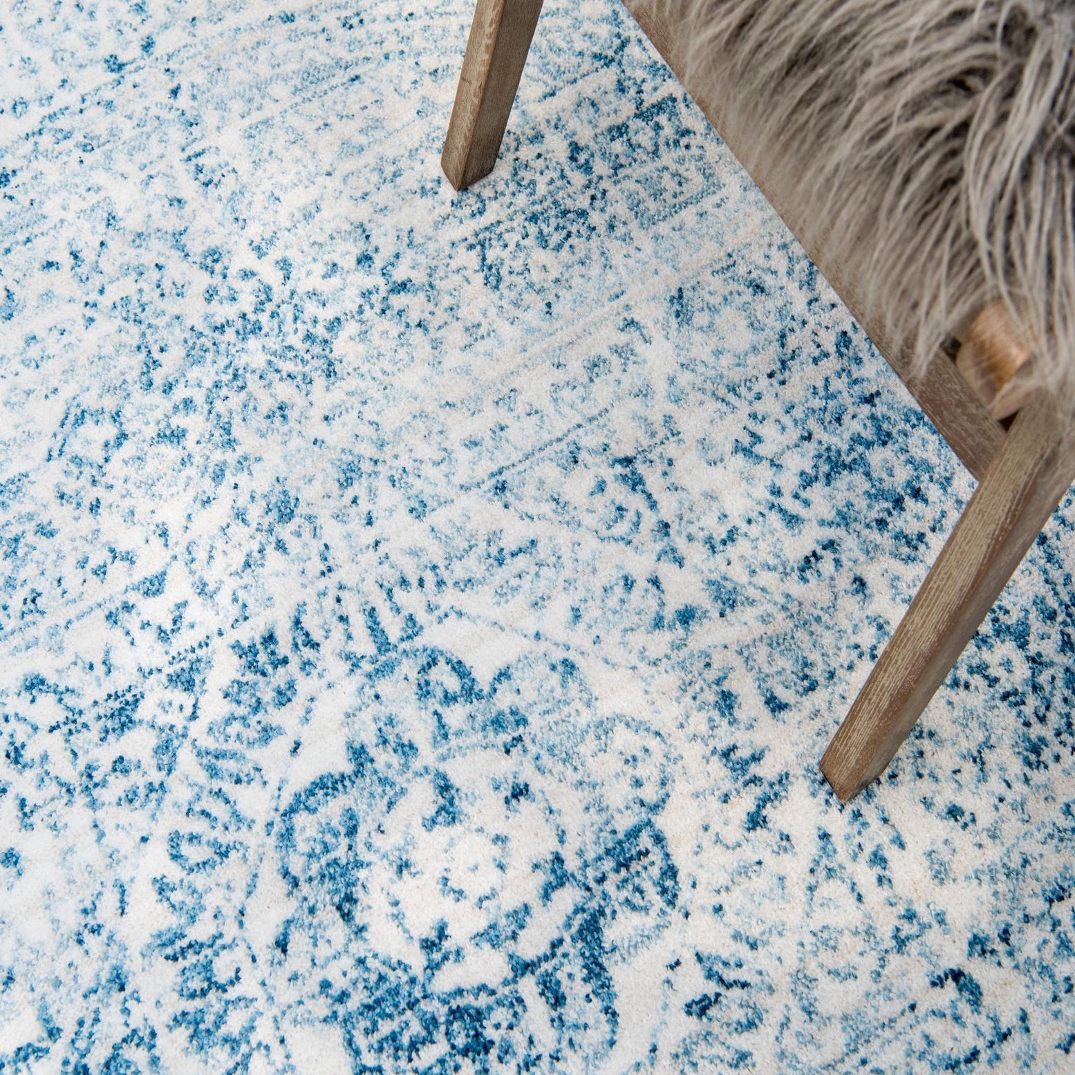 A soft, vintage-inspired medallion rests on a light blue background, with ivory fields and navy blue accents woven through a gently distressed motif. Subtle floral and geometric elements emerge from the faded finish, giving the rug a worn-in character without heavy contrast. Machine Made of 100% Polyester (Space-Dyed Yarn), the construction delivers a softly textured surface with subtle tonal variation from the space-dyed fibers that catch light and add depth to the pale blue ground.