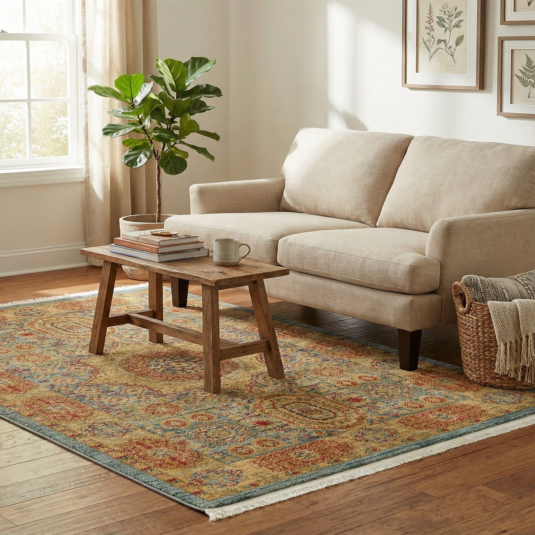 This piece works well in smaller living spaces, a welcoming foyer, or layered in front of a sofa to add color and pattern without overwhelming the room. It pairs naturally with warm wood tones and painted furniture, and complements traditional, transitional, coastal, or cottage interiors — as well as eclectic spaces that mix vintage and modern elements. Combine it with neutral upholstery, brass or aged-metal accents, and natural fiber textiles for a balanced, lived-in look.