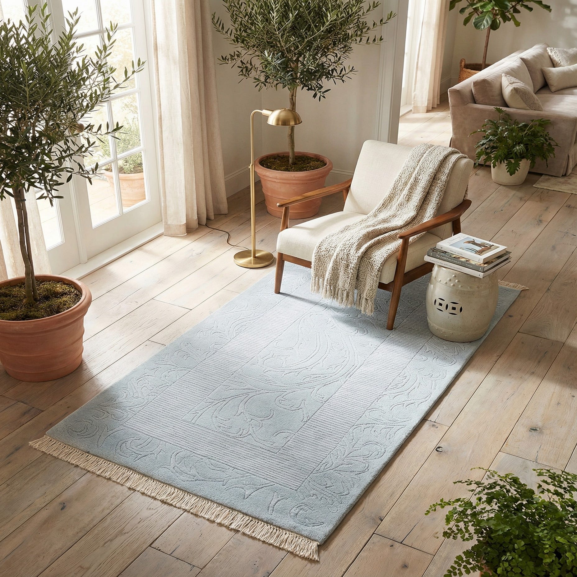 This piece works well in calm, layered interiors—think coastal-inspired living rooms, serene bedrooms, or a soft-hued nursery. It pairs easily with light woods, linen upholstery, and muted metallic accents for a modern-traditional or Scandinavian look, and can anchor a seating area or sit comfortably under a small coffee table to add quiet texture.