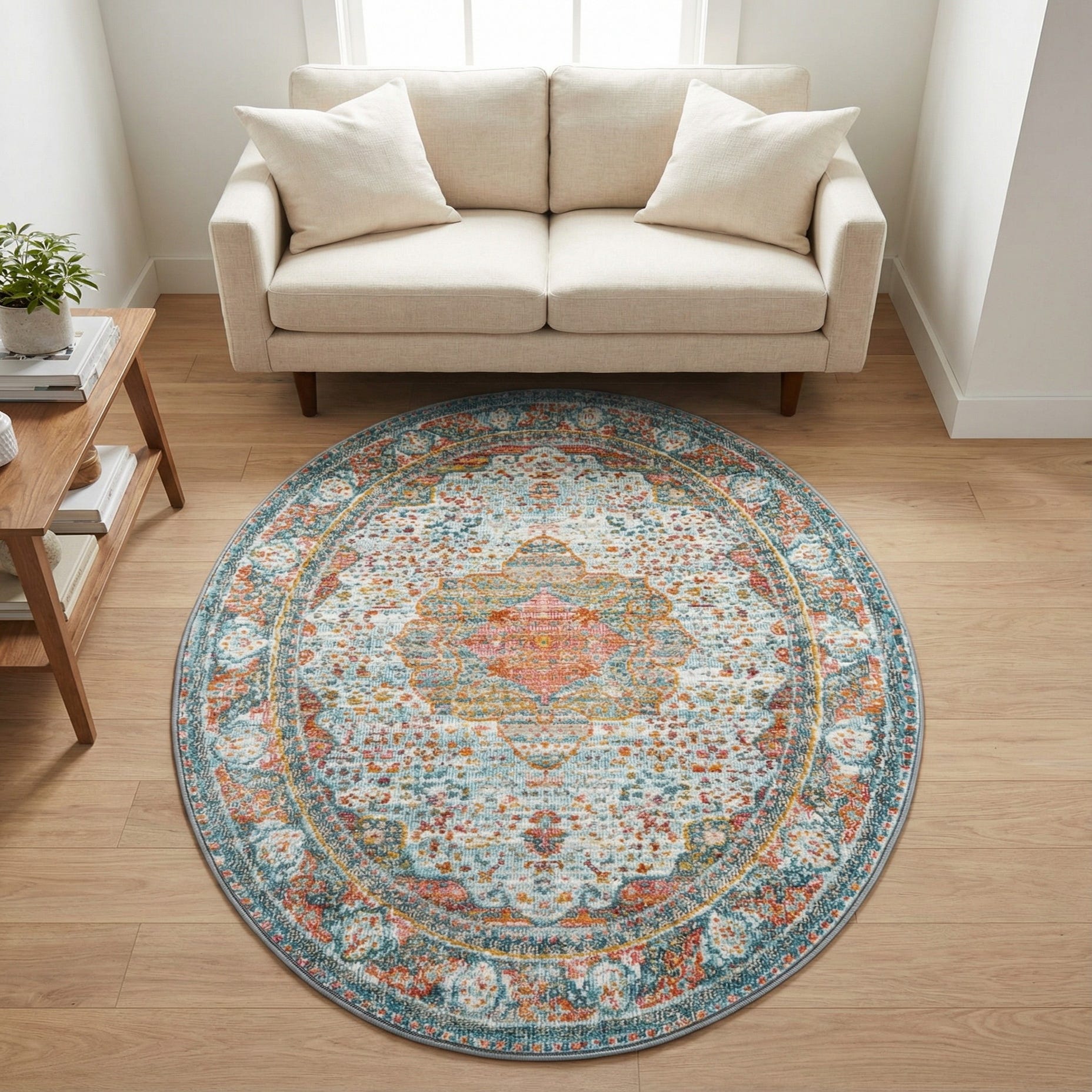 A faded medallion sits at the center of a soft, light blue field, surrounded by a classic floral border that gives the oval shape a graceful, vintage-inspired look. Orange and pink highlights form the focal motifs, while splashes of turquoise and ivory thread through the pattern like paint on a watercolor ground, creating a lively yet balanced color story. The ornamentation is detailed but relaxed, with tiny speckled accents that add a worn, artisanal character.