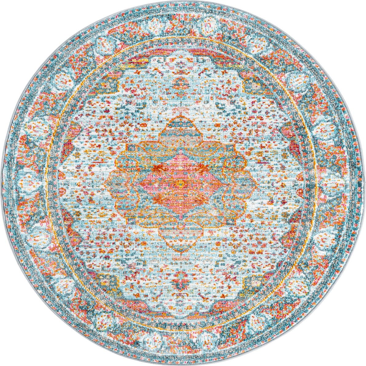 Primary color is Light Blue. Colors in this rug include: Light Blue, Orange, Turquoise, Pink, Ivory.
