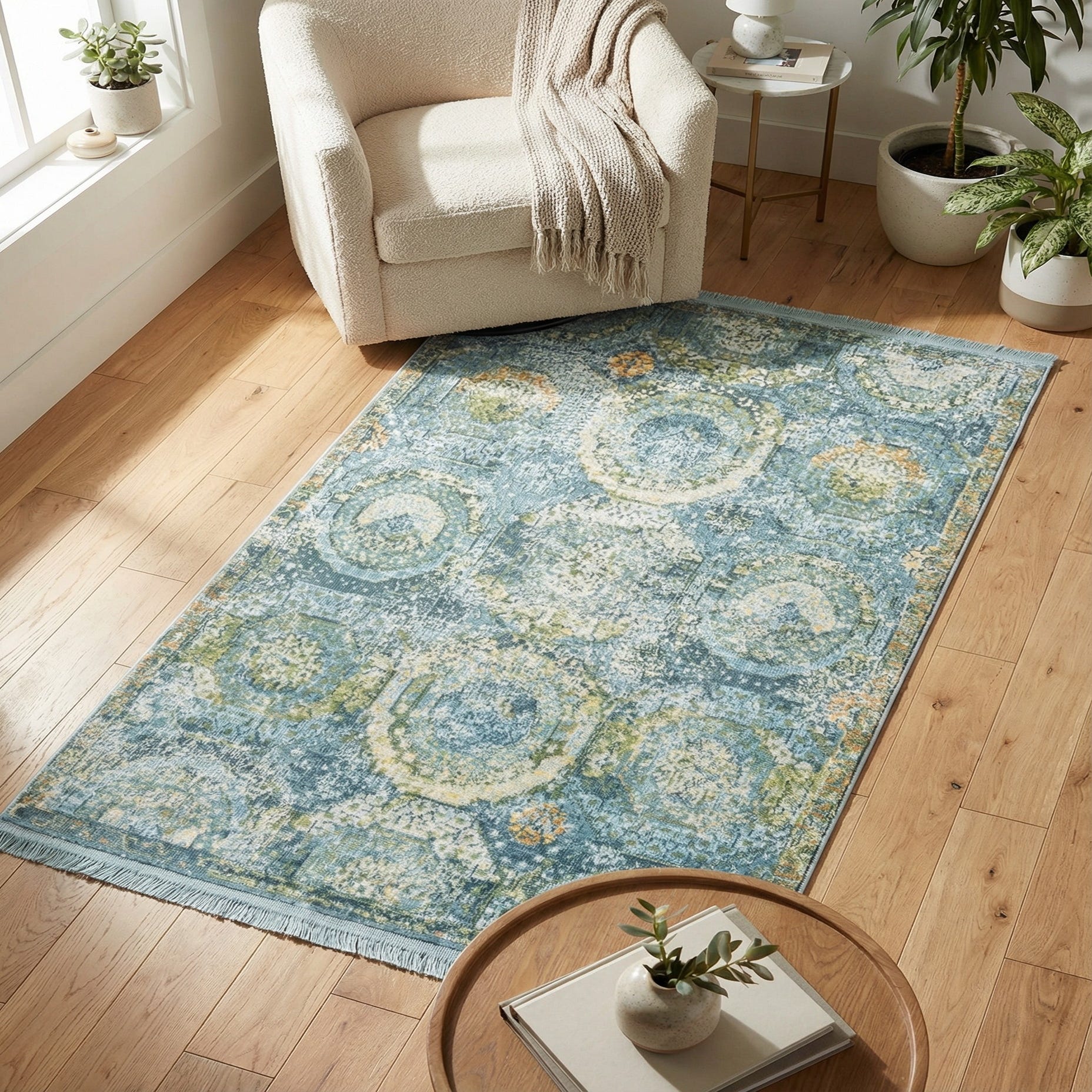 This piece pairs easily with coastal, transitional, or modern farmhouse interiors—place it in an entryway, beside a bed, or under a small coffee table to introduce color and pattern without overwhelming the space. It complements light linen upholstery, warm wood finishes and leafy greenery, and works well layered over hardwood or tile to add texture and visual interest.