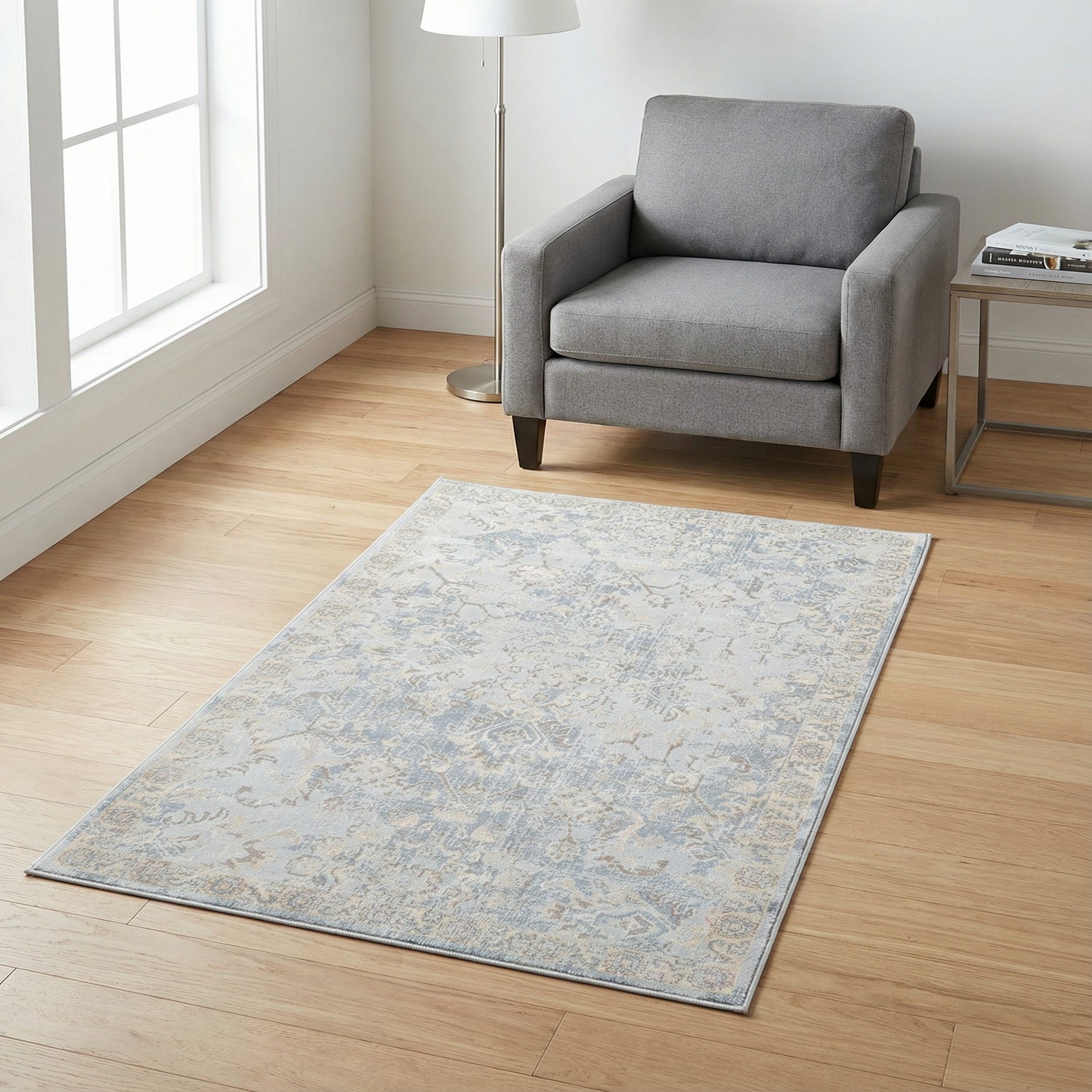This rug suits coastal, cottage, or transitional interiors and works well to anchor a small seating group, soften a bedside, or define an entryway. Pair it with weathered wood furniture, pale linens and brushed-metal accents for a calm, layered palette, or let it temper bolder navy or tan upholstery while adding a touch of traditional charm to modern furnishings.