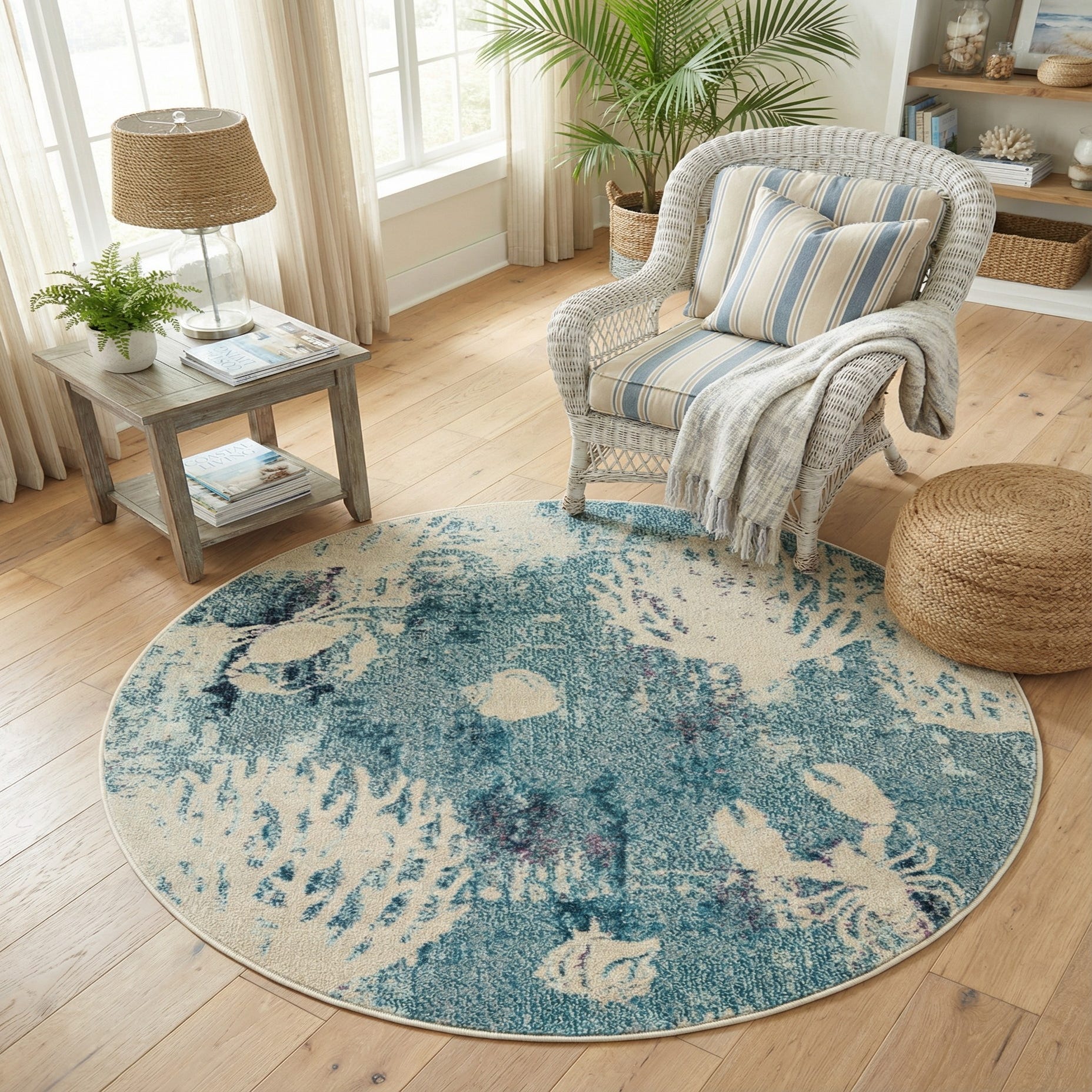 Soft underfoot with a casual, coastal-inspired look, this round rug has a light blue background punctuated by areas of beige and ivory that form organic, shell- and coral-like silhouettes. Deeper navy-blue accents thread through the pattern, giving depth and contrast to the painterly, slightly distressed motifs. Machine made from 100% polypropylene, the pile has a low-to-medium profile that feels plush enough for bare feet while maintaining a tidy, upholstered appearance.