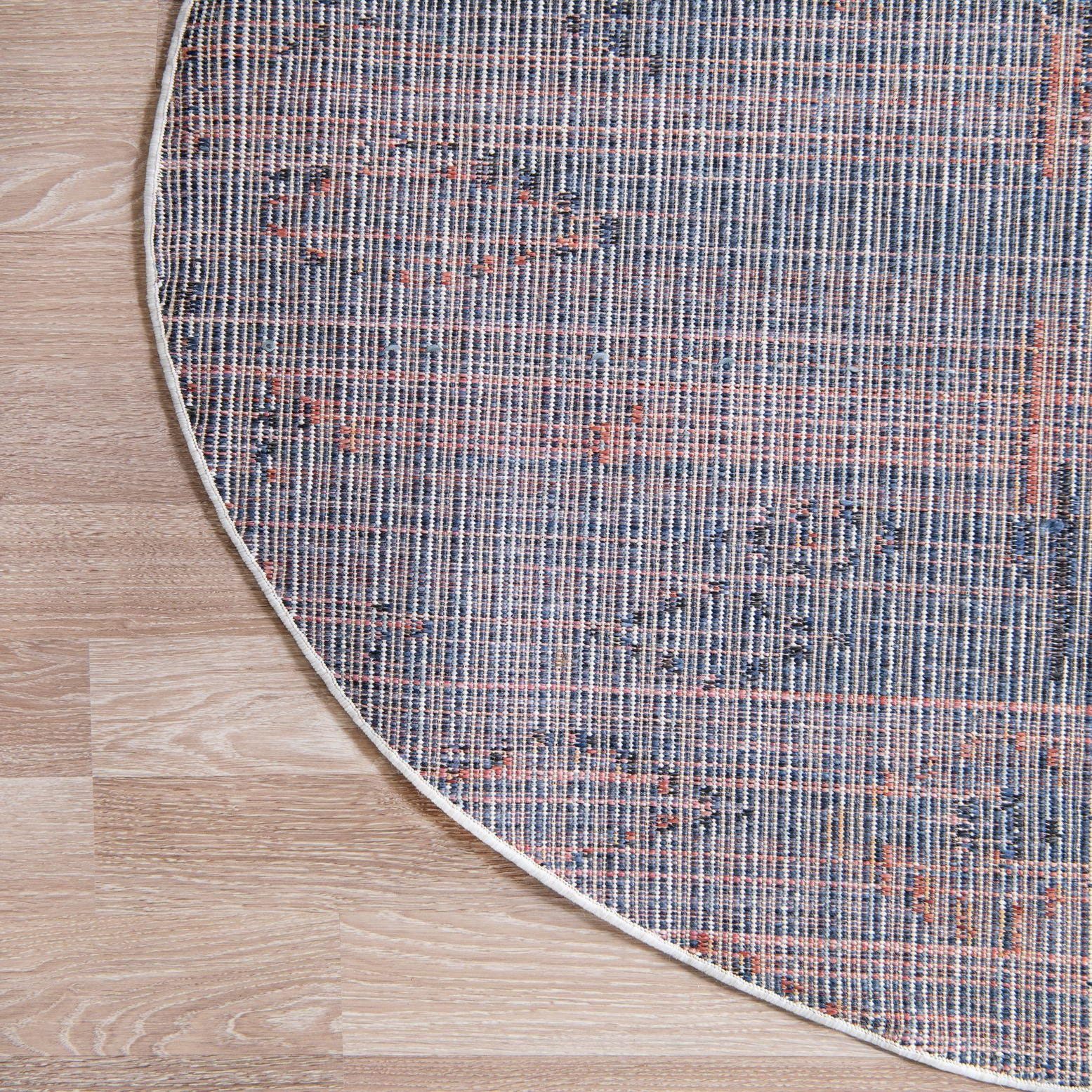 Well-suited to casual living rooms, coastal or bohemian bedrooms, and sunlit reading nooks, this round design is an easy way to introduce color and pattern without overwhelming a space. Place it beneath a round dining table or layer it over hardwood to anchor seating; it pairs especially well with light wood tones, navy upholstery, rust or mustard accents, and textured linens for a relaxed, collected look.
