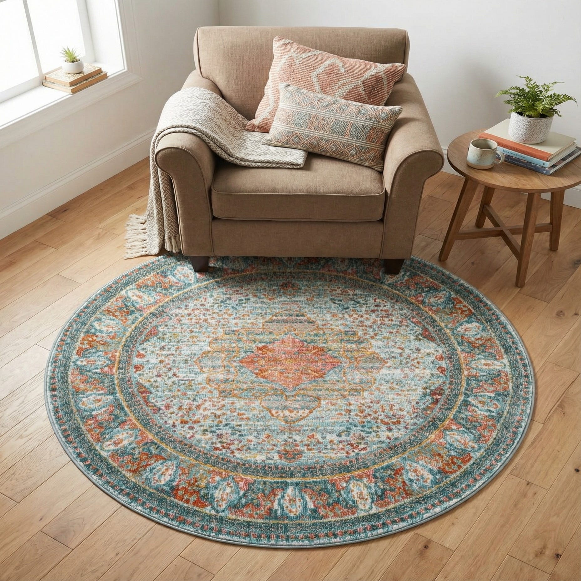 Place this rug beneath a round dining table or in a cozy seating nook to introduce color without overwhelming the room. It pairs well with white-washed or natural wood furniture, rattan accents, and warm brass or copper lighting for a coastal or cottage vibe; alternatively, pair it with navy upholstery and bold coral accessories for a modern eclectic look. The color mix also works nicely in a nursery, home office, or entryway where a touch of pattern and soft texture will tie the space together.