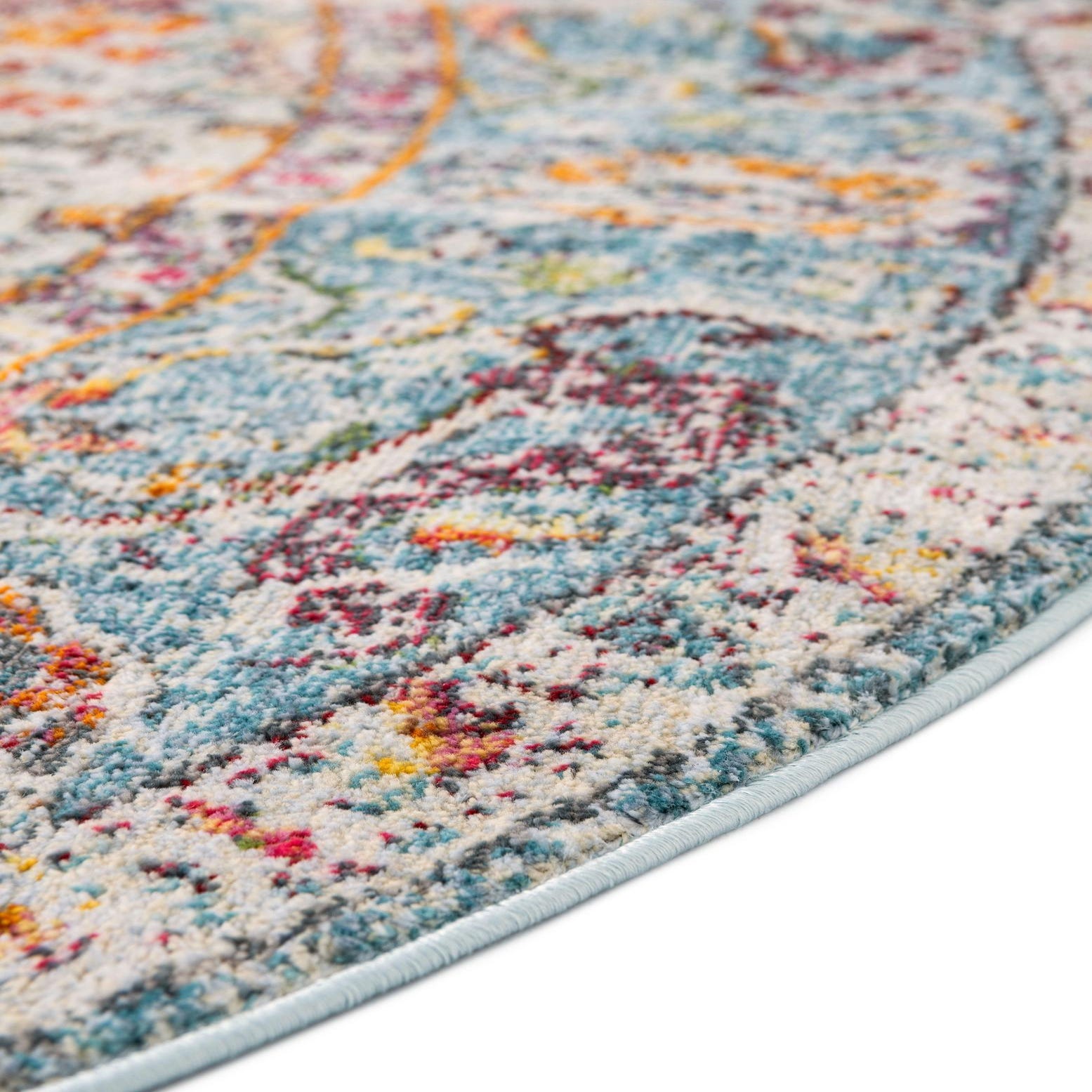 A round medallion sits at the center of this rug, surrounded by layered floral and scroll motifs rendered in a softly distressed, vintage-inspired pattern. A light blue field provides a cool, airy background while cream and gold form the central medallion; pops of orange, red, turquoise and purple animate the ornamentation. The surface is machine made of 100% polypropylene with a low, even pile that feels smooth underfoot and shows subtle texture where colors and pattern overlap.