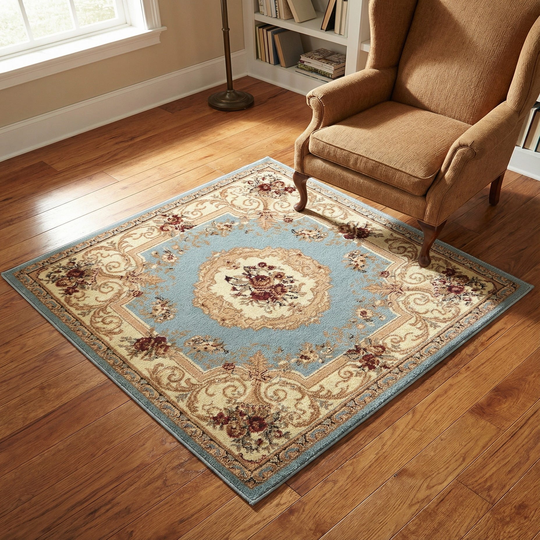 This piece works well in formal living rooms, entryways, or a reading nook where traditional details are desired without heavy visual weight. Pair it with warm wood furnishings and cream upholstery to emphasize the tan and brown tones, or use it to introduce color into a neutral, transitional scheme by echoing the light blue and red accents in pillows or curtains. It also layers nicely over hardwood or tile to define a small seating area or under an accent table to bring a touch of classic pattern into a compact space.