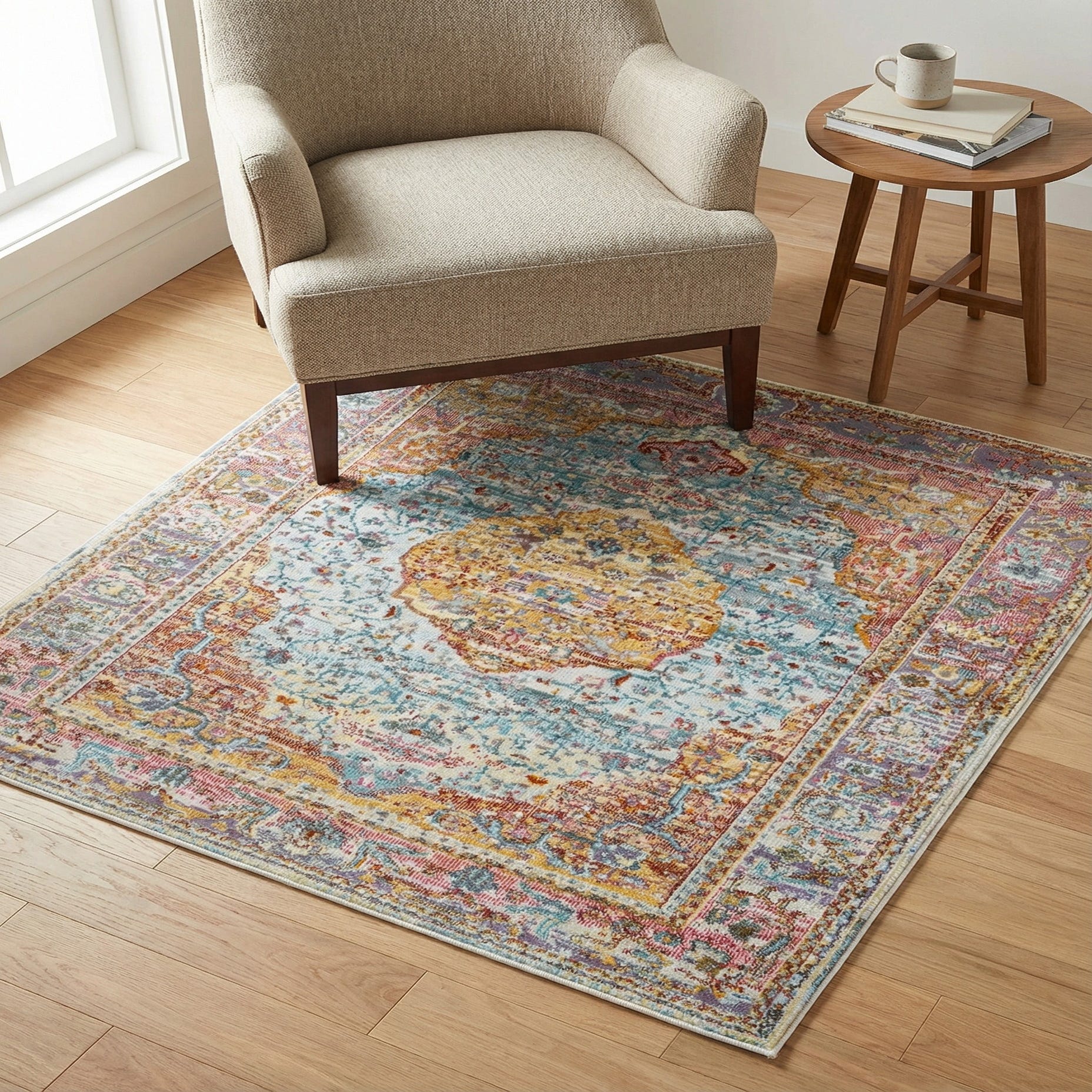 This rug works well anchored beneath a coffee table in a bright living room, layered at the foot of a bed to add color to neutral linens, or placed in an entry to set a welcoming tone. Pair it with light wood furniture and linen fabrics for a coastal-transitional scheme, or layer with textured throws and rattan accents in a relaxed bohemian setting. Its mix of warm and cool tones also complements painted cabinetry or upholstered pieces in navy, mustard, or soft violet for a coordinated, intentional look.