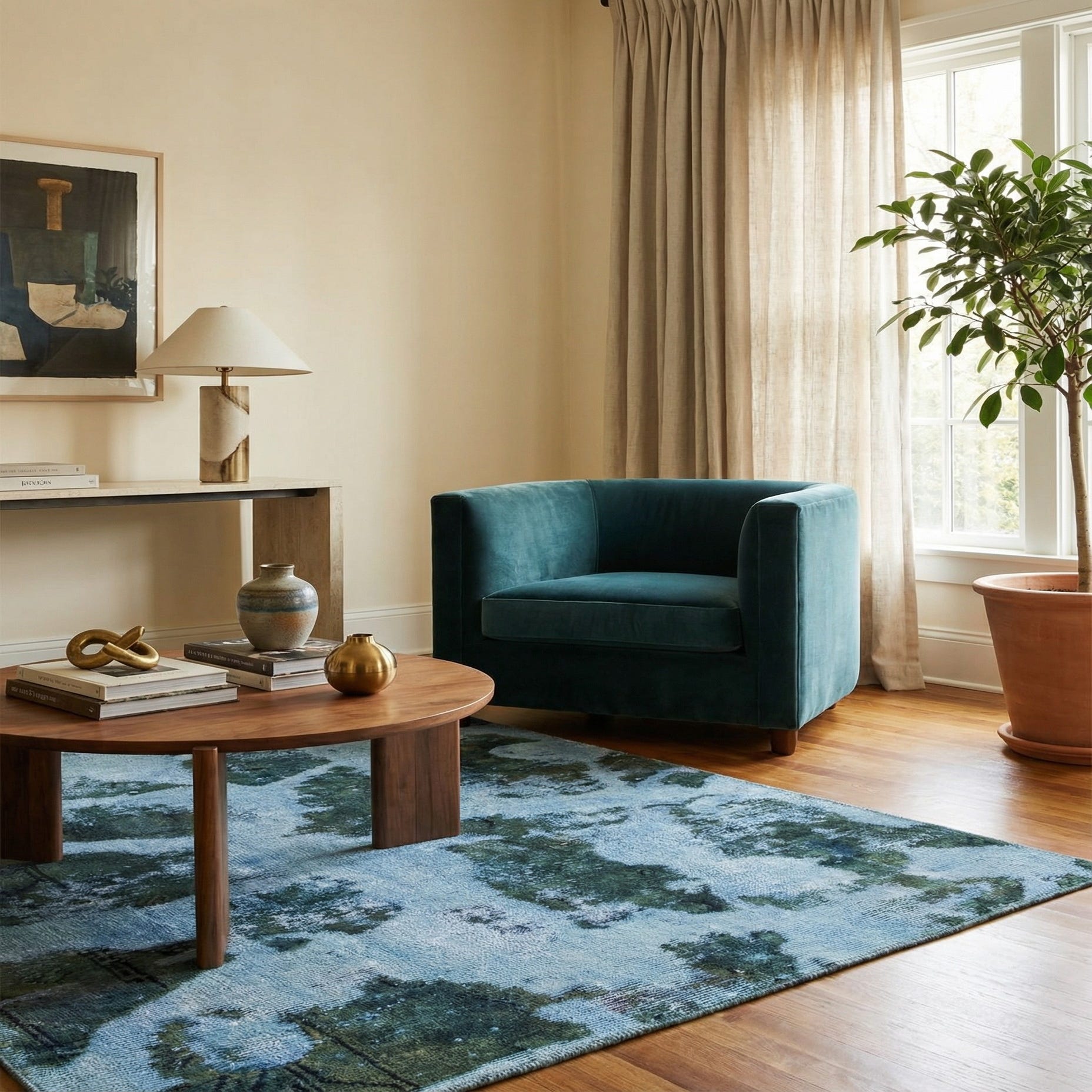 The compact square shape works well as an anchor for a small seating group, layered at the foot of a bed, or to define a cozy reading nook or home office. It pairs naturally with warm wood tones, white or navy upholstery, and matte metal finishes, and complements modern coastal, transitional, or eclectic interiors that favor a muted, layered color palette.