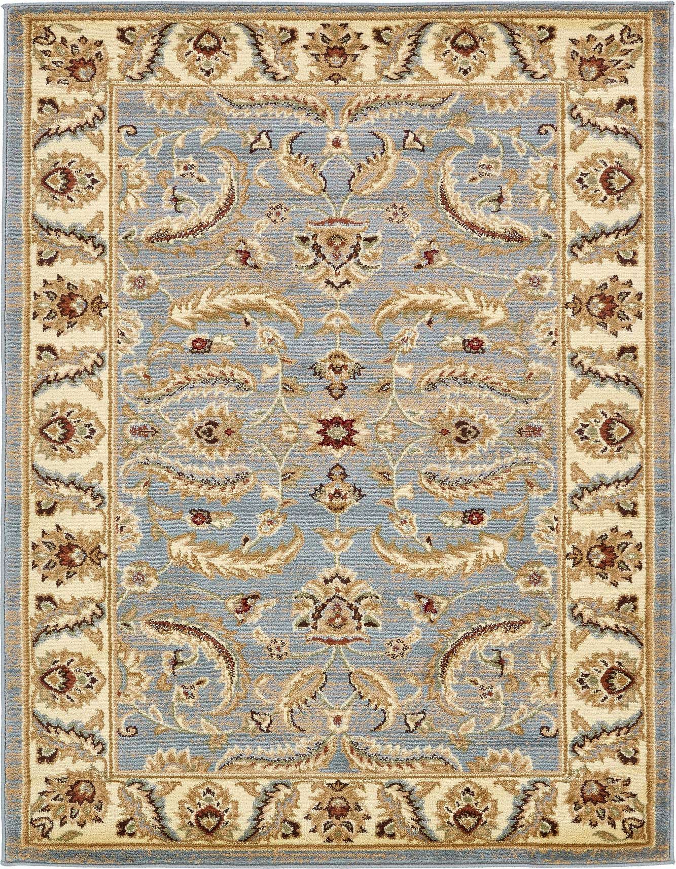 The Aditi collection introduces a beautifully designed rug featuring a delicate pattern that infuses any room with a touch of elegance. The light blue background of this rug provides a serene canvas for the ornate botanical motifs highlighted in shades of brown, cream, green, red, rust red, and tan. A prominent classic border frames the design, accentuating its traditional aesthetic.