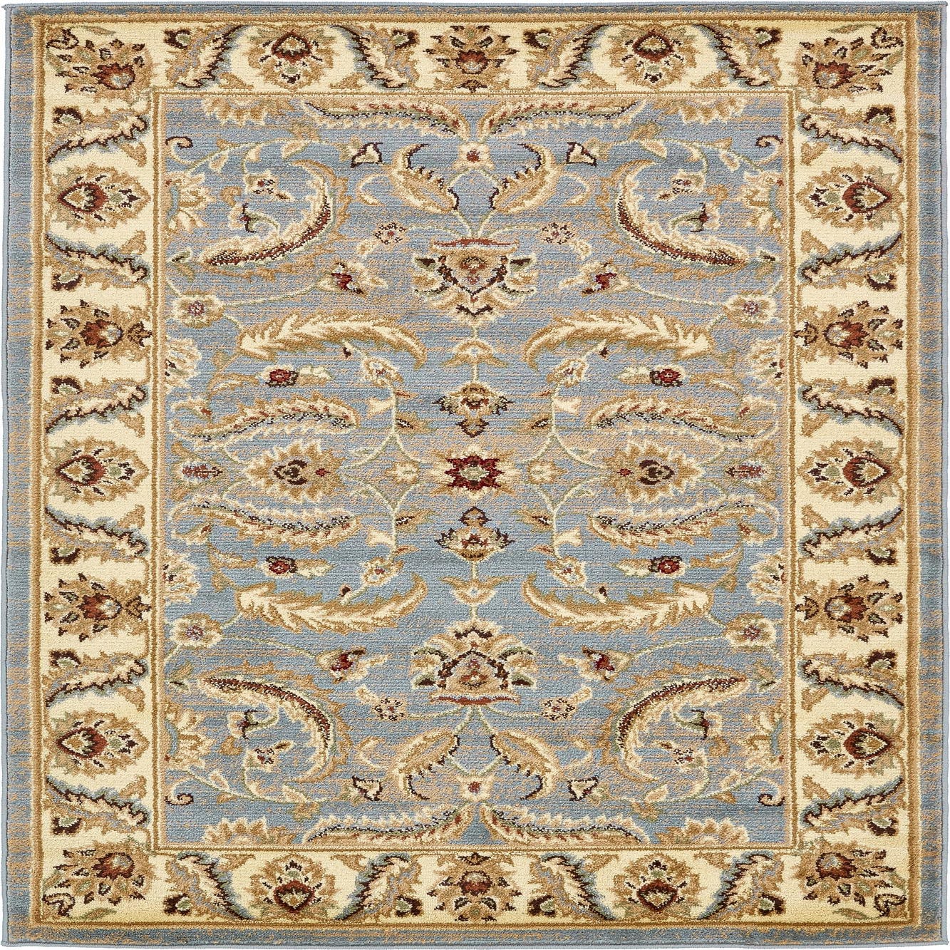 Primary color is Light Blue. Colors in this rug include: Light Blue, Brown, Cream, Green, Red, Rust Red, Tan.