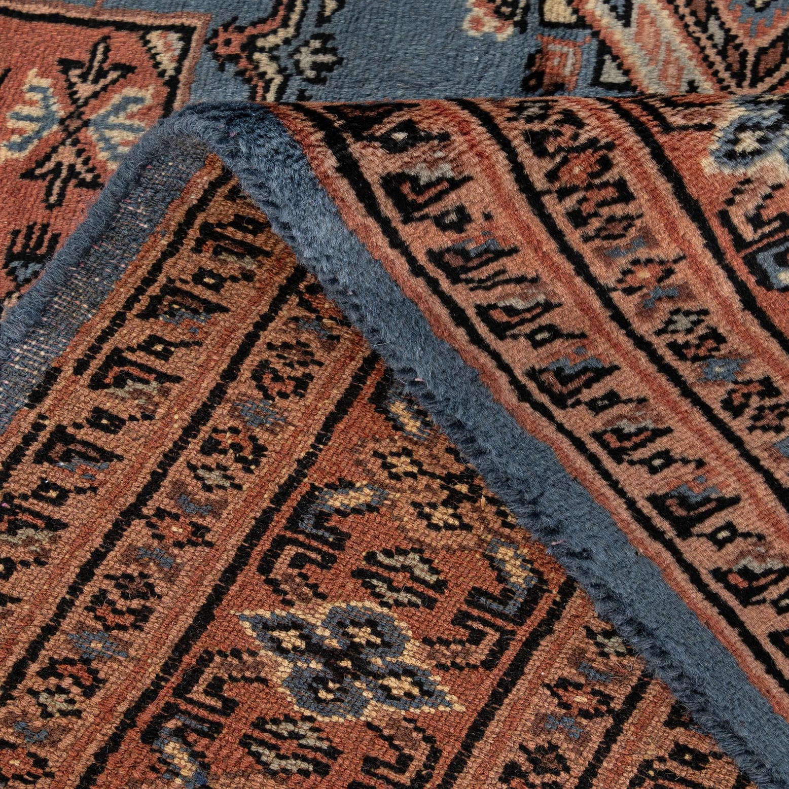 A 4x6 rectangular Bokhara rug featuring a light blue field with intricate terracotta, black, and cream tribal patterns and a detailed border, suitable for an entryway or living room.