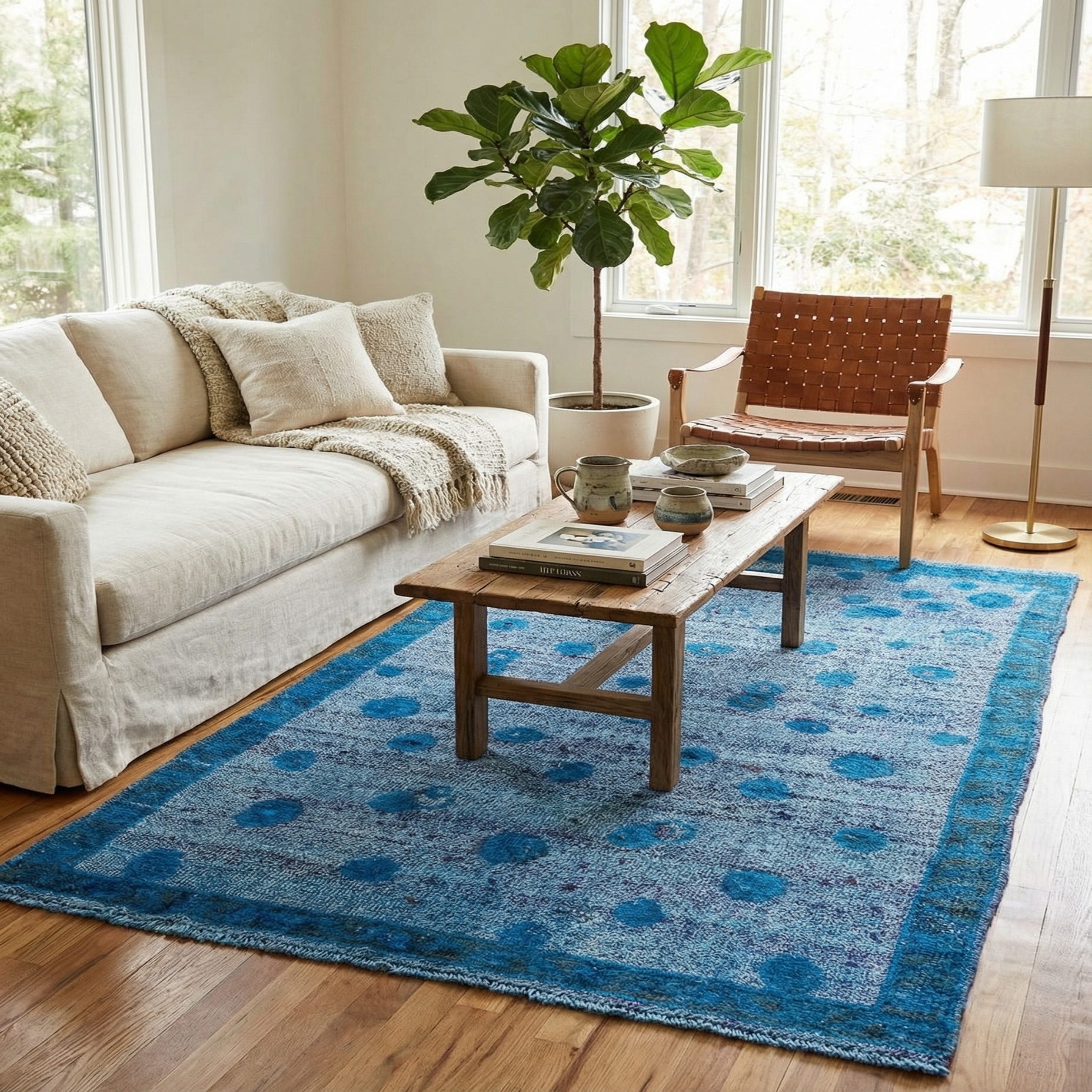 A 4x6 rectangular Darya rug in varying shades of blue, featuring a modern abstract polka dot pattern and a darker blue border.