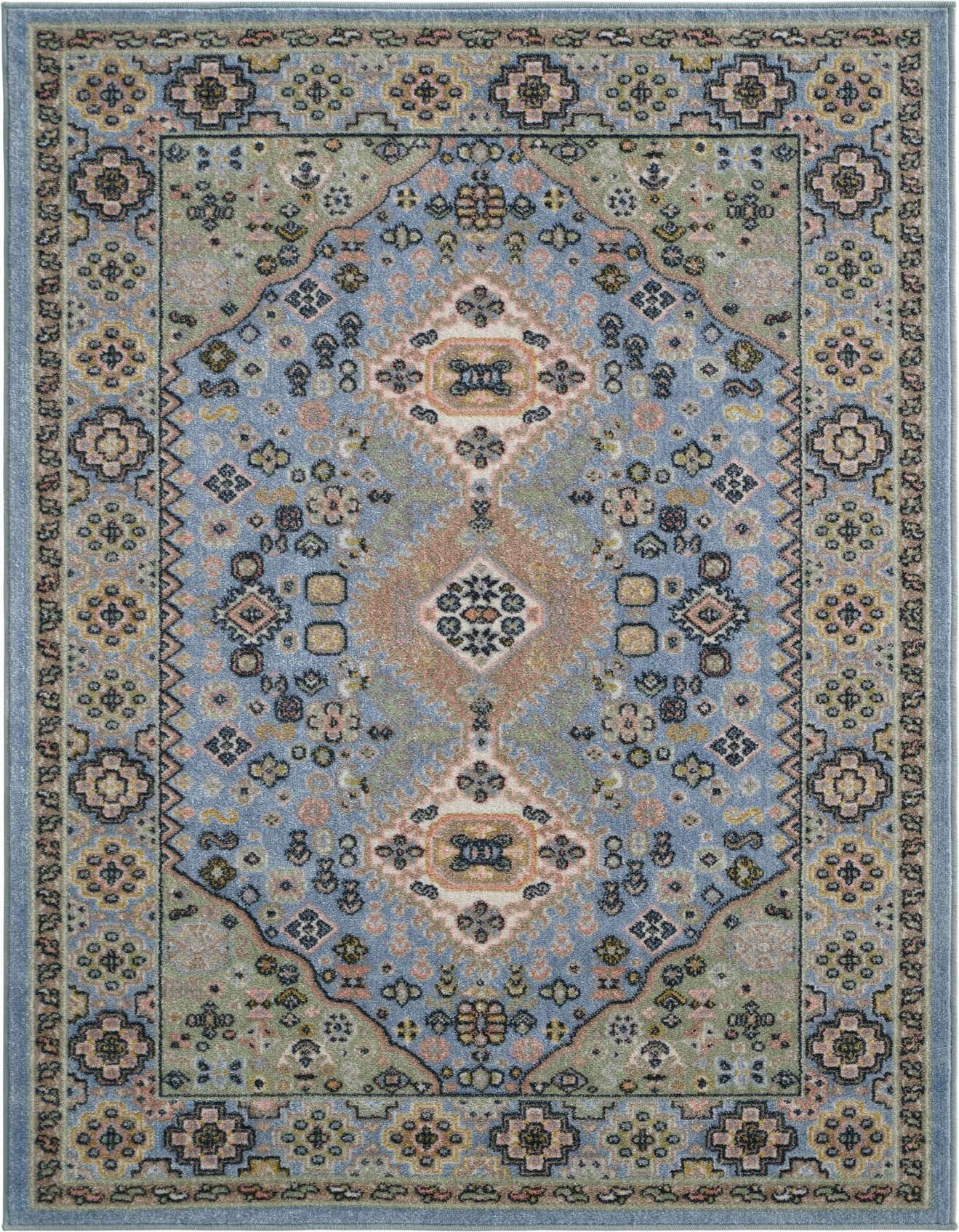 Primary color is Light Blue. Colors in this rug include: Light Blue, Black, Ivory, Pink, Gray, Green.