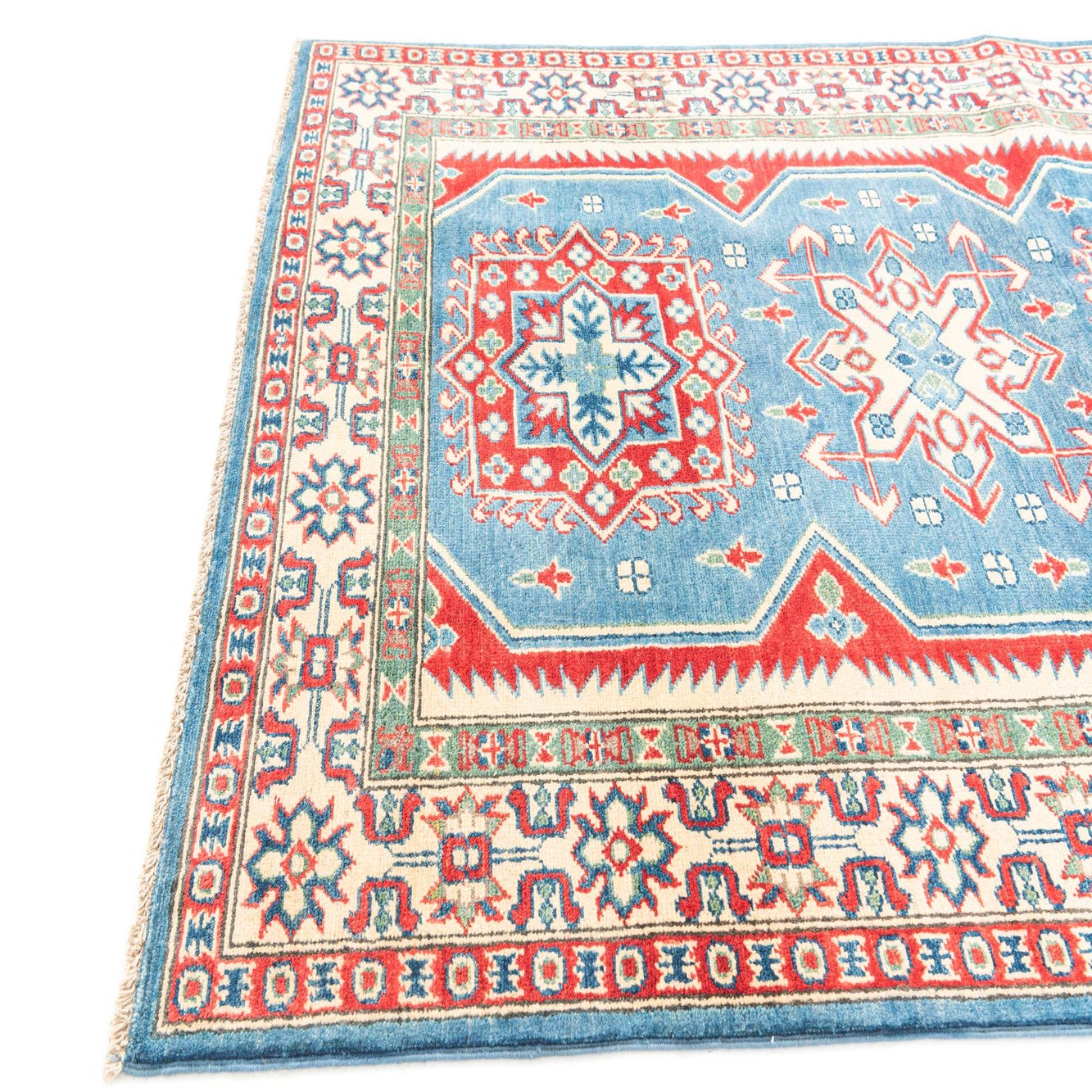 A 4x6 rectangular Kazak rug with a traditional Southwestern pattern in blue, red, and cream.