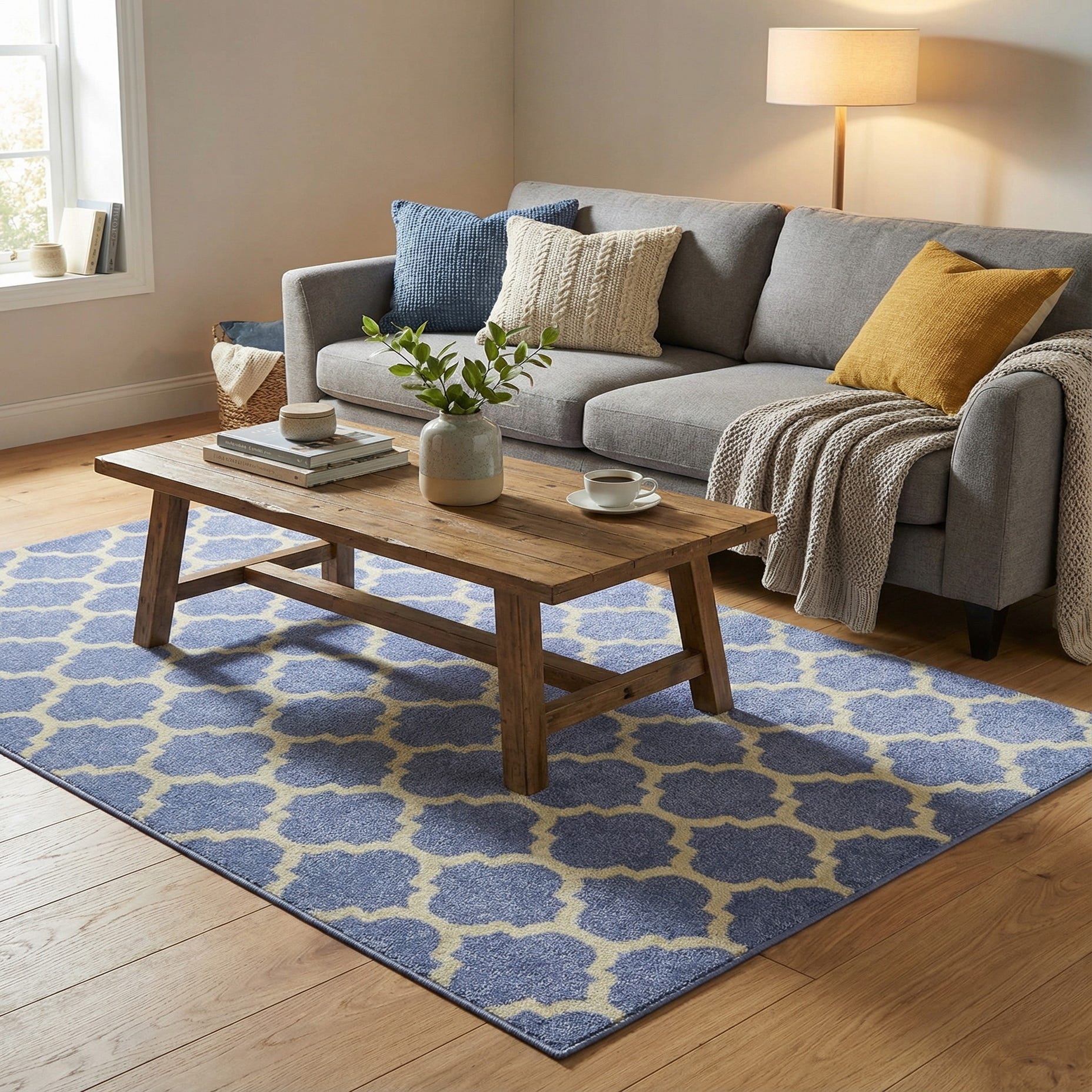 Machine-made of 100% polypropylene, this rug has a low-profile, soft pile that feels smooth underfoot while keeping the pattern crisp. A light blue field provides a calm, airy backdrop for a repeating beige trellis motif—rounded quatrefoil shapes that create a balanced, geometric rhythm across the surface. The subtle contrast between the field and the pattern gives the rug a layered look and a tactile presence when you run your hand across it.