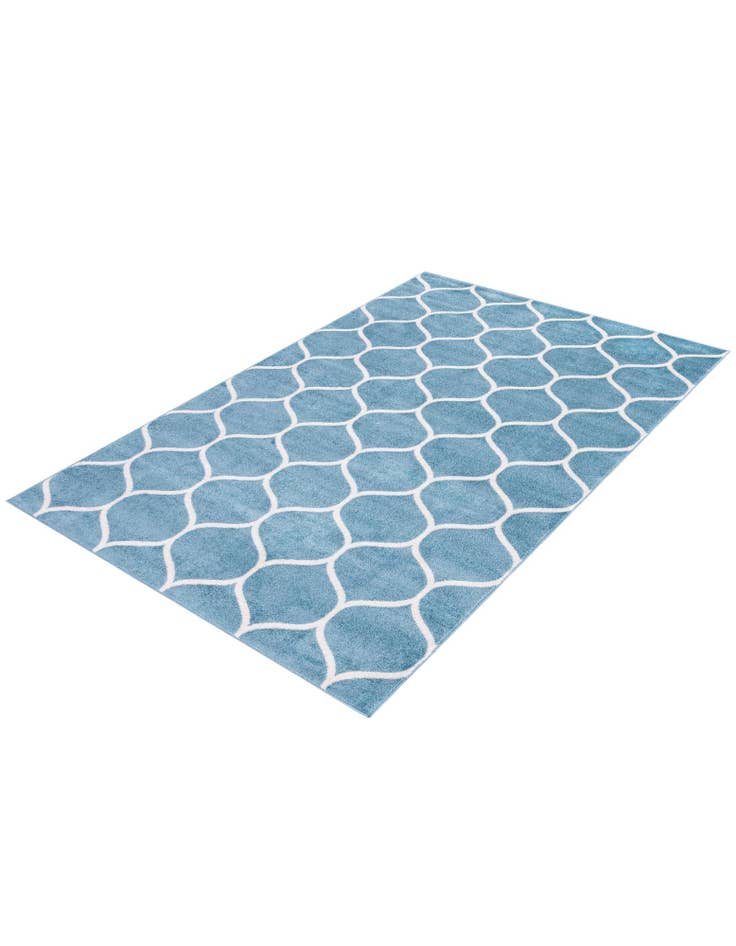 A 4x6 rectangular light blue rug with a repeating white modern trellis pattern, suitable for a living room.