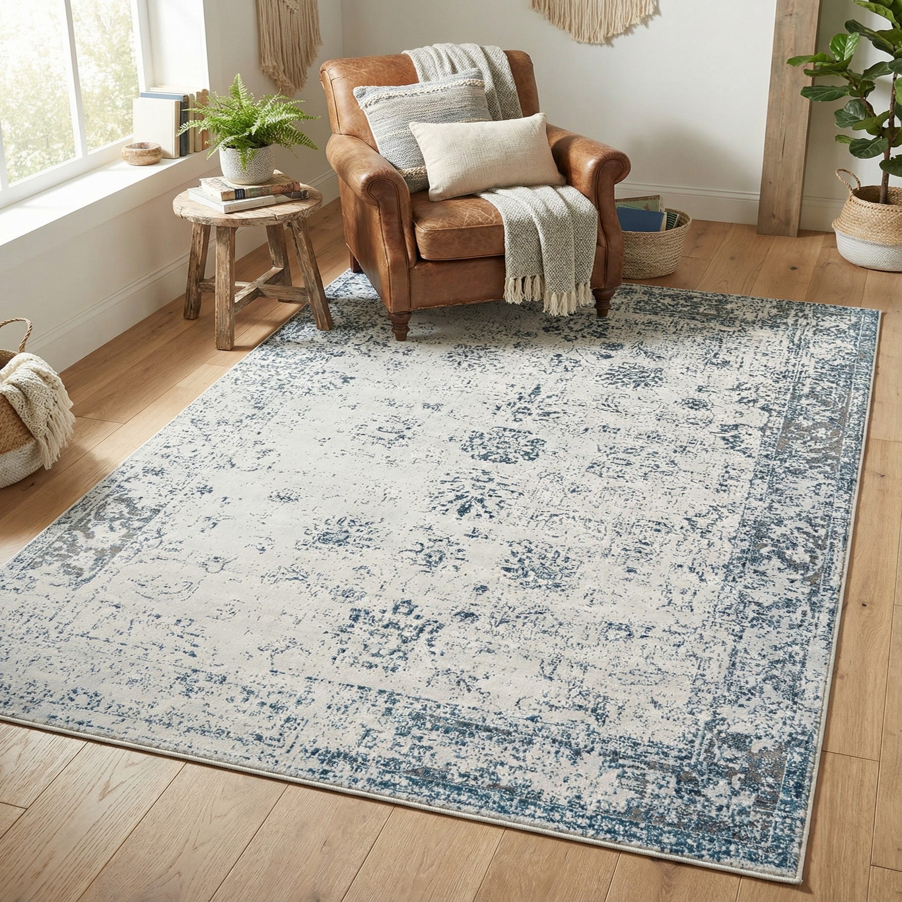 Pair this rug with pale woods and white linens for a coastal or breezy cottage look, or layer it under a gray sofa and glass coffee table in a transitional living room to bring quiet texture and color. It also works well in a bedroom to soften hardwood floors, in a compact dining nook, or as an anchoring piece in a home office or reading corner where a touch of muted blue and ivory brightens the space.
