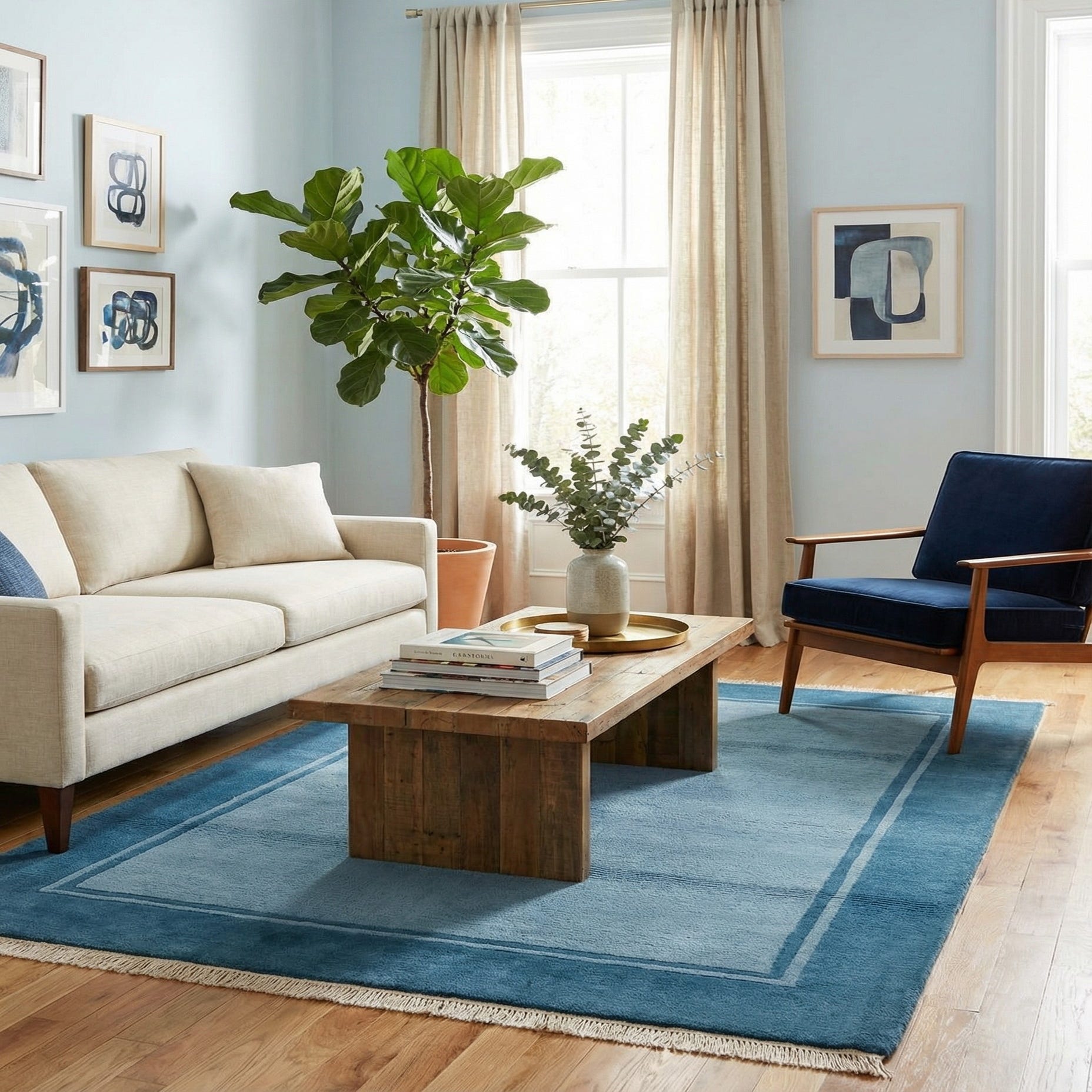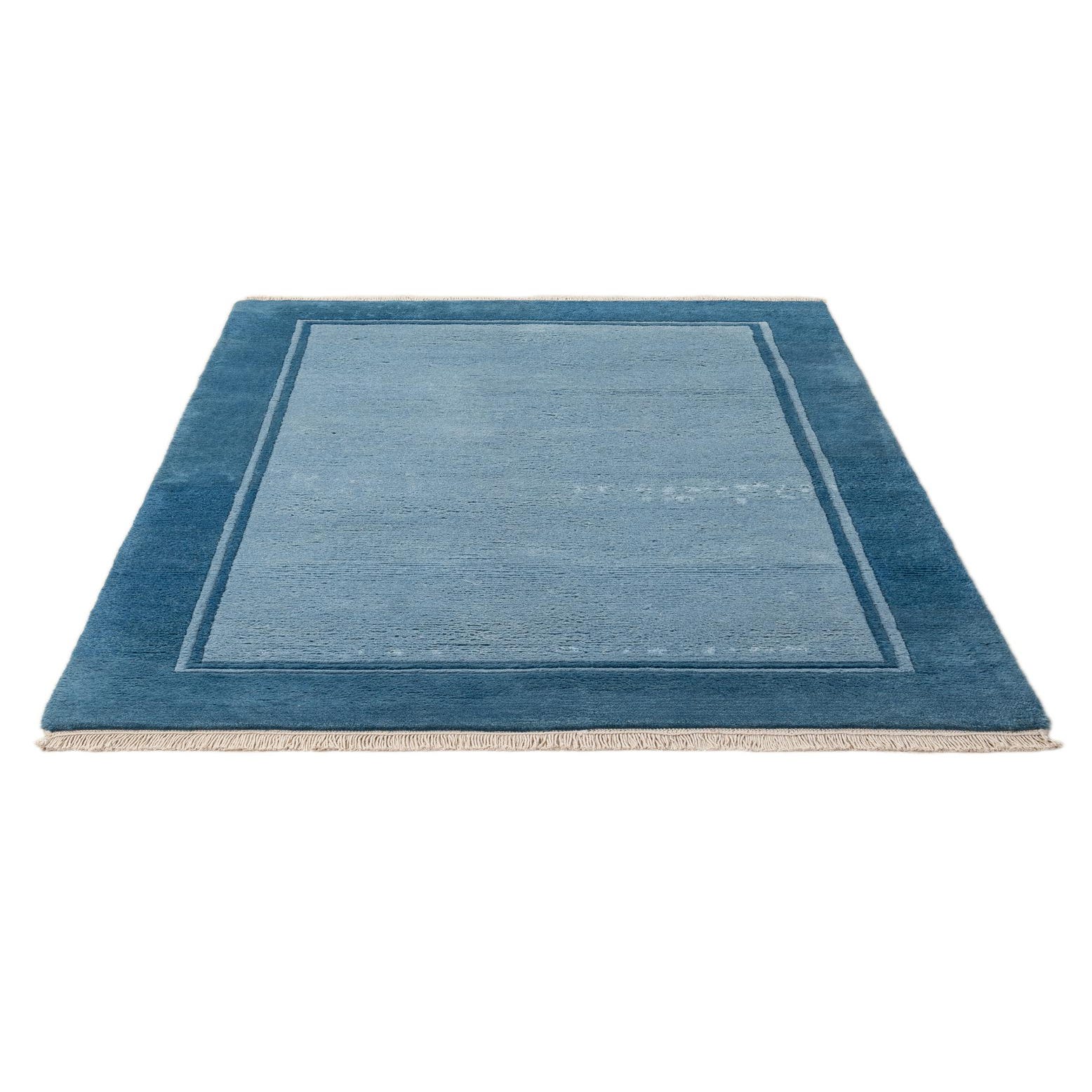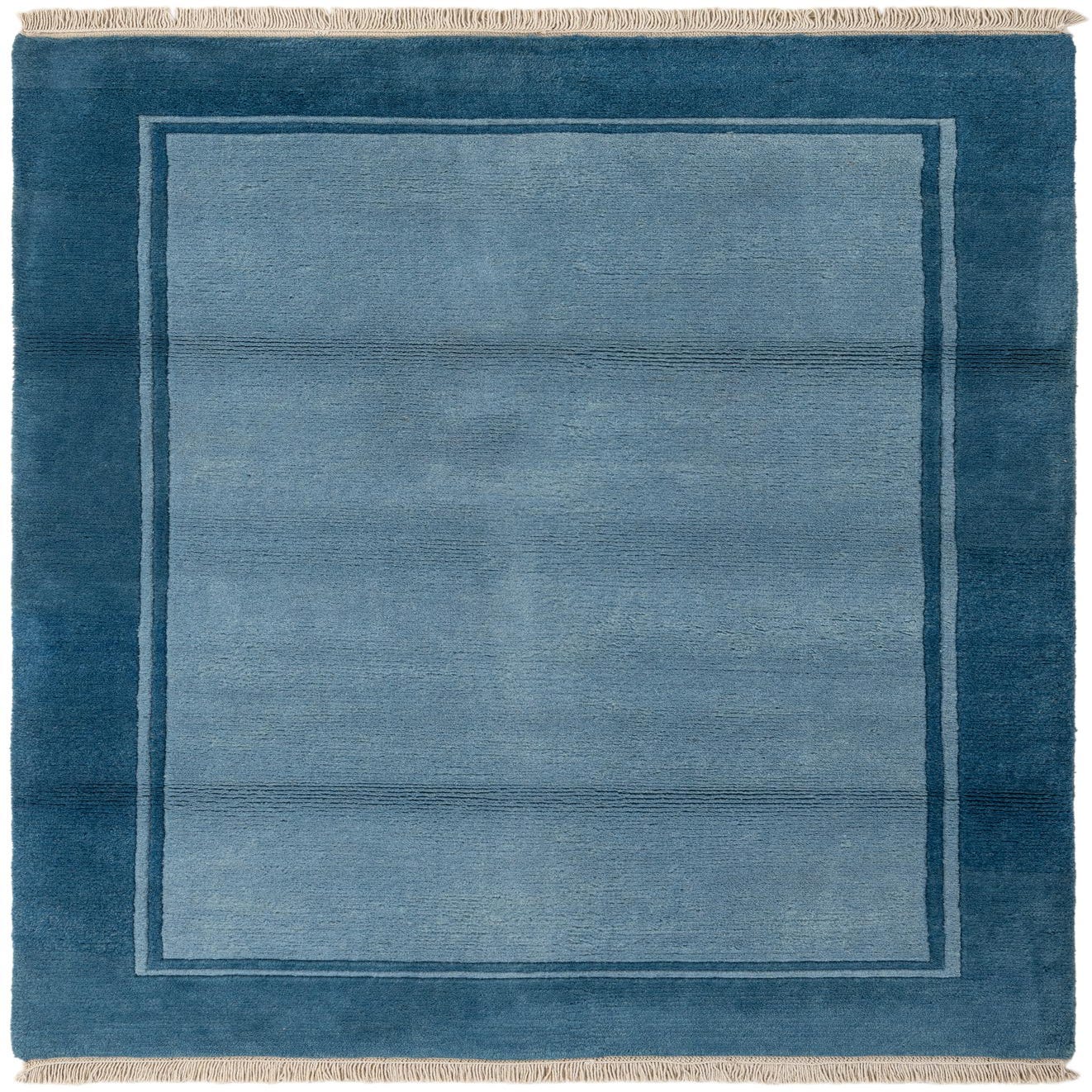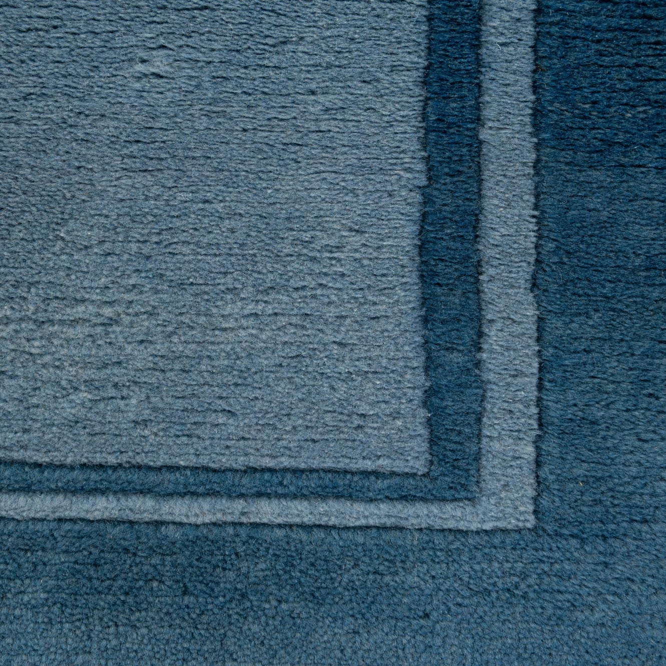 A 4x6 rectangular Nepal Collection wool rug featuring a light blue center with subtle horizontal lines and a deep blue border, suitable for a living room.