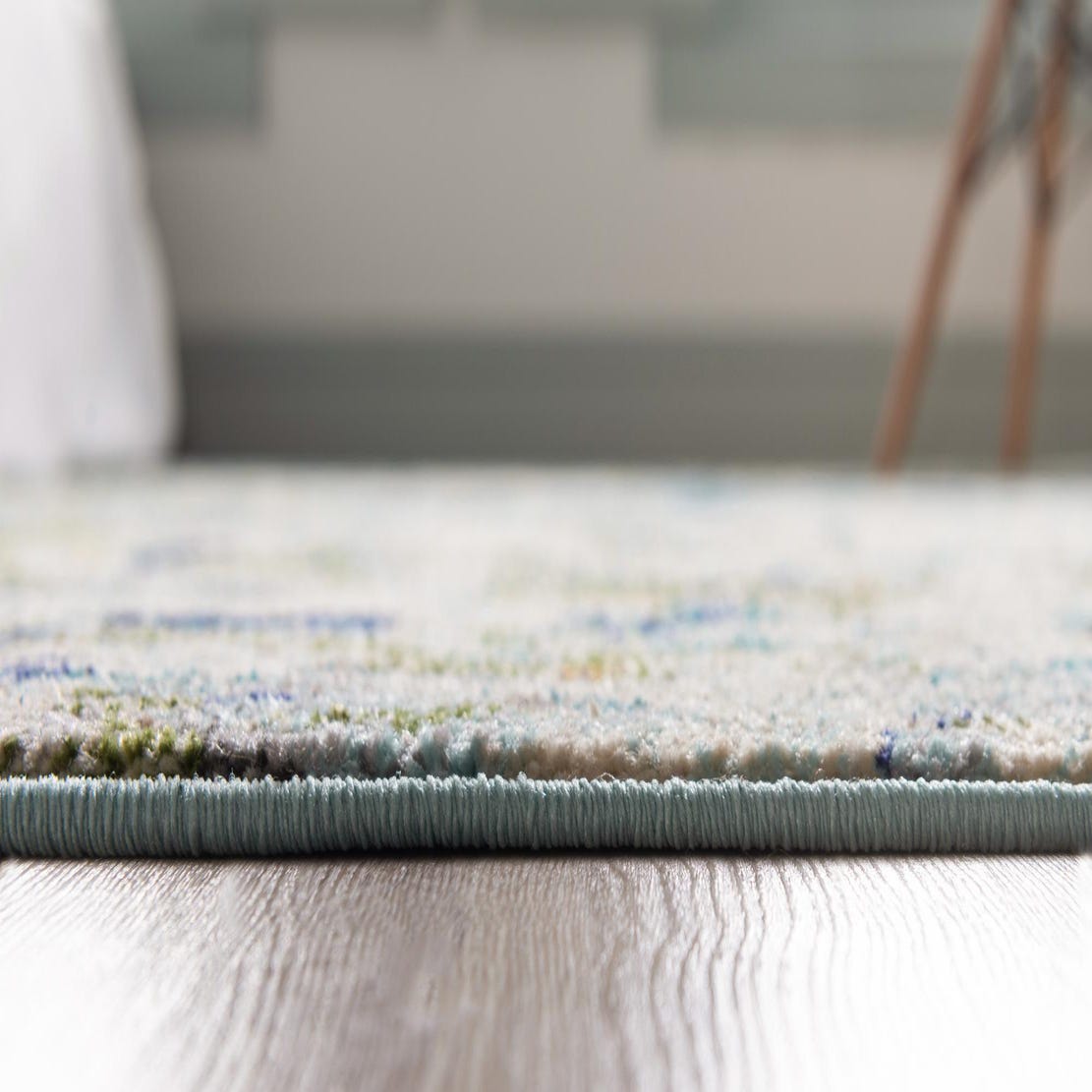 This rug works well in relaxed, contemporary settings — place it under a small seating group, at the foot of a bed, or layered over hardwoods to add color and movement without overwhelming the room. It pairs naturally with light wood tones, white or ivory upholstery, navy accent pillows, and leafy green plants for a fresh coastal or modern-transitional look. The cool blue background and deeper blue and green accents give enough visual interest to anchor a room while remaining versatile with a variety of decor palettes.