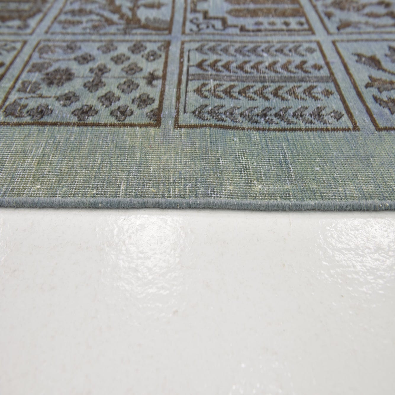 Hand knotted of 100% wool, this rug presents a rectilinear patchwork of individual panels—each box filled with a distinct motif: stylized trees and branches, arched medallions, clustered floral repeats and geometric lattice work. The motifs are rendered in warm brown against a light blue ground, with narrow brown lines separating each panel to create a calm, orderly rhythm. The surface has a soft, natural wool hand and a low, dense pile that registers subtle variations from the hand-knotting process, giving the design a gently aged appearance and a pleasant tactile depth underfoot.