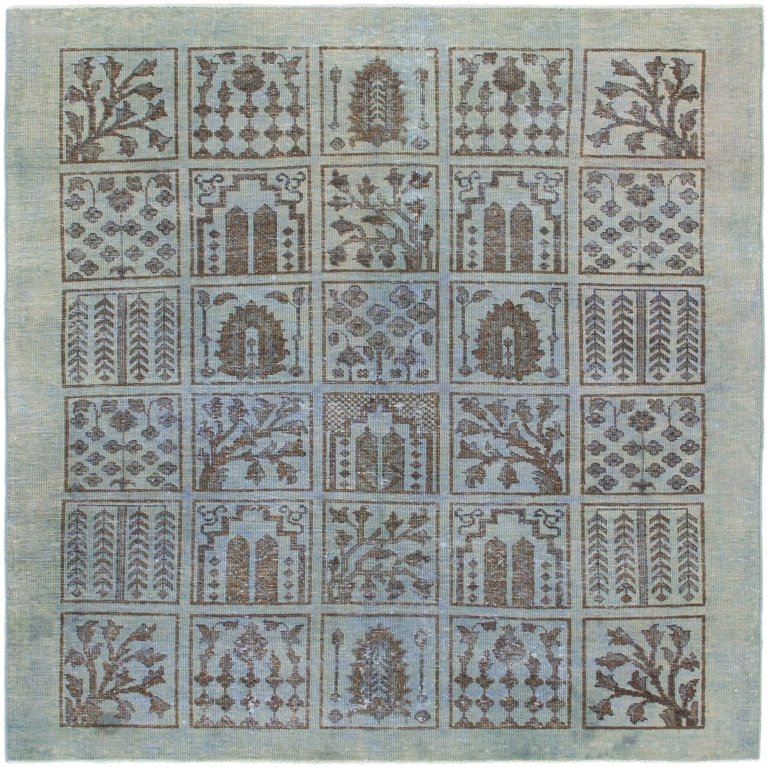 A 4x6 rectangular light blue wool rug with a distressed Persian-inspired grid pattern featuring various brown floral and geometric motifs.