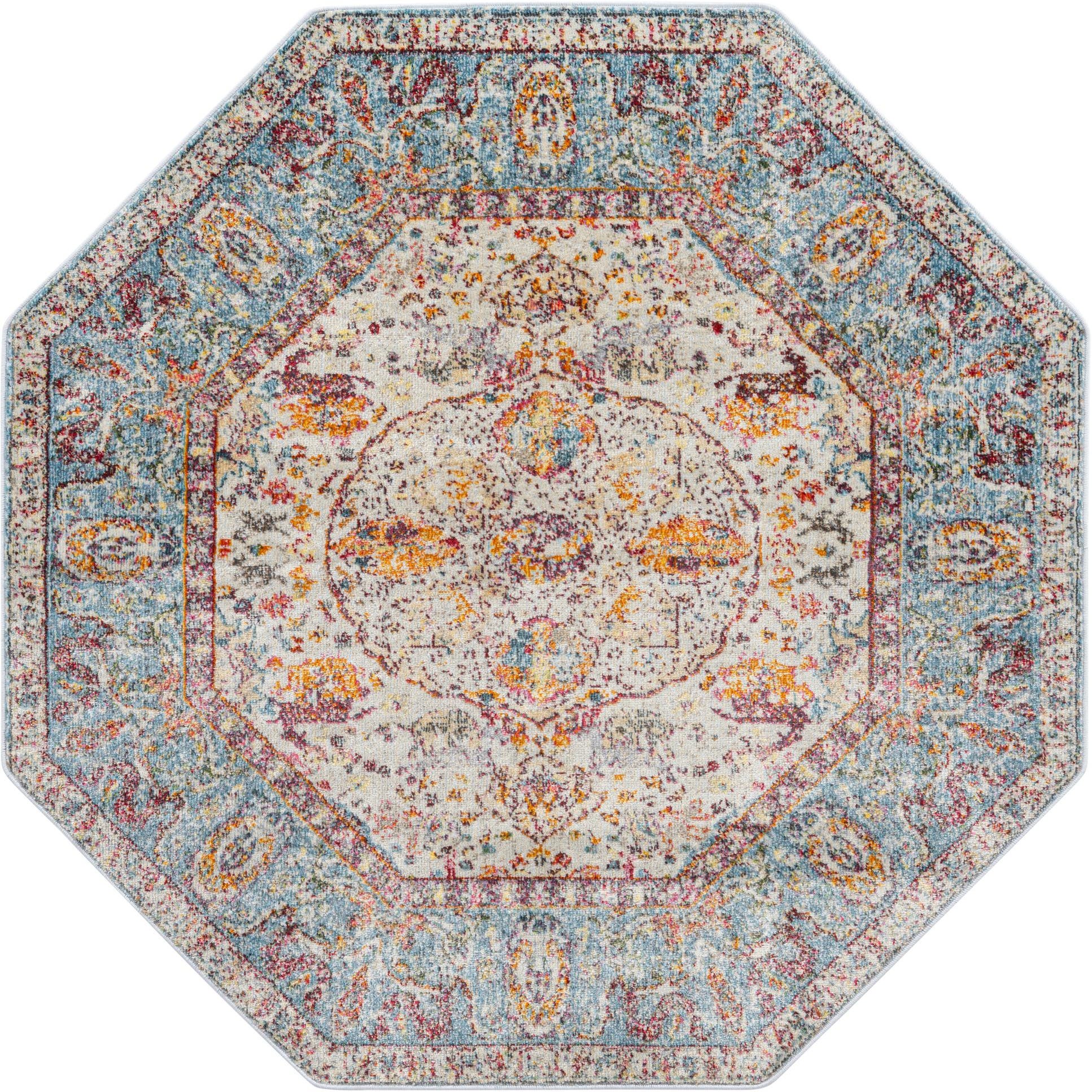 A soft cream medallion sits at the center of this octagonal rug, surrounded by a light blue field that frames the design. Traditional floral and arabesque motifs are rendered in a gently distressed, vintage-inspired pattern with pops of gold, orange, turquoise, red and purple against deeper blue accents. The overall effect is layered and lived-in: the central motif and surrounding border contrast yet harmonize through a speckled color wash that gives the piece subtle visual movement.