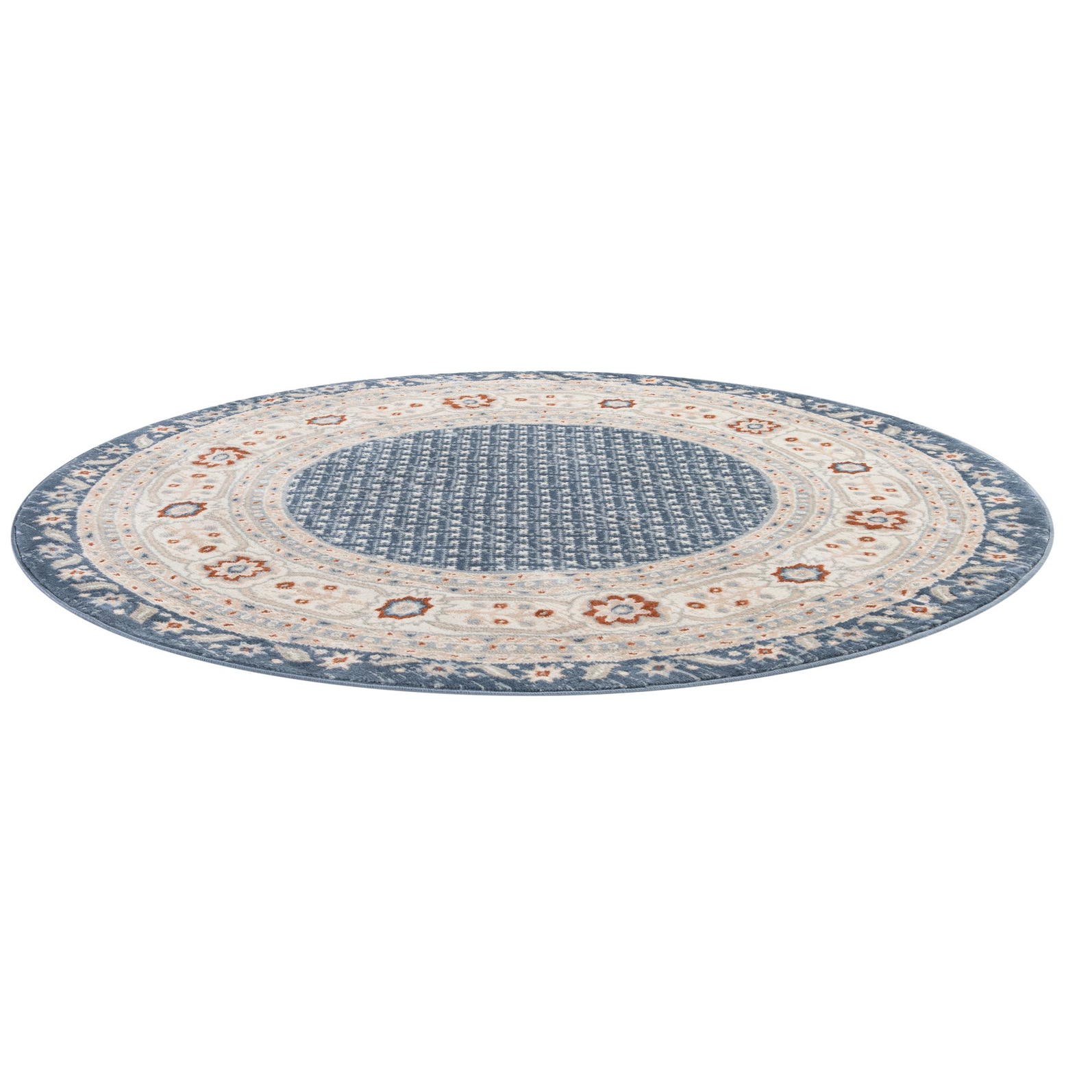 A 5' 3 round modern rug in shades of blue with a cream and rust floral medallion border.