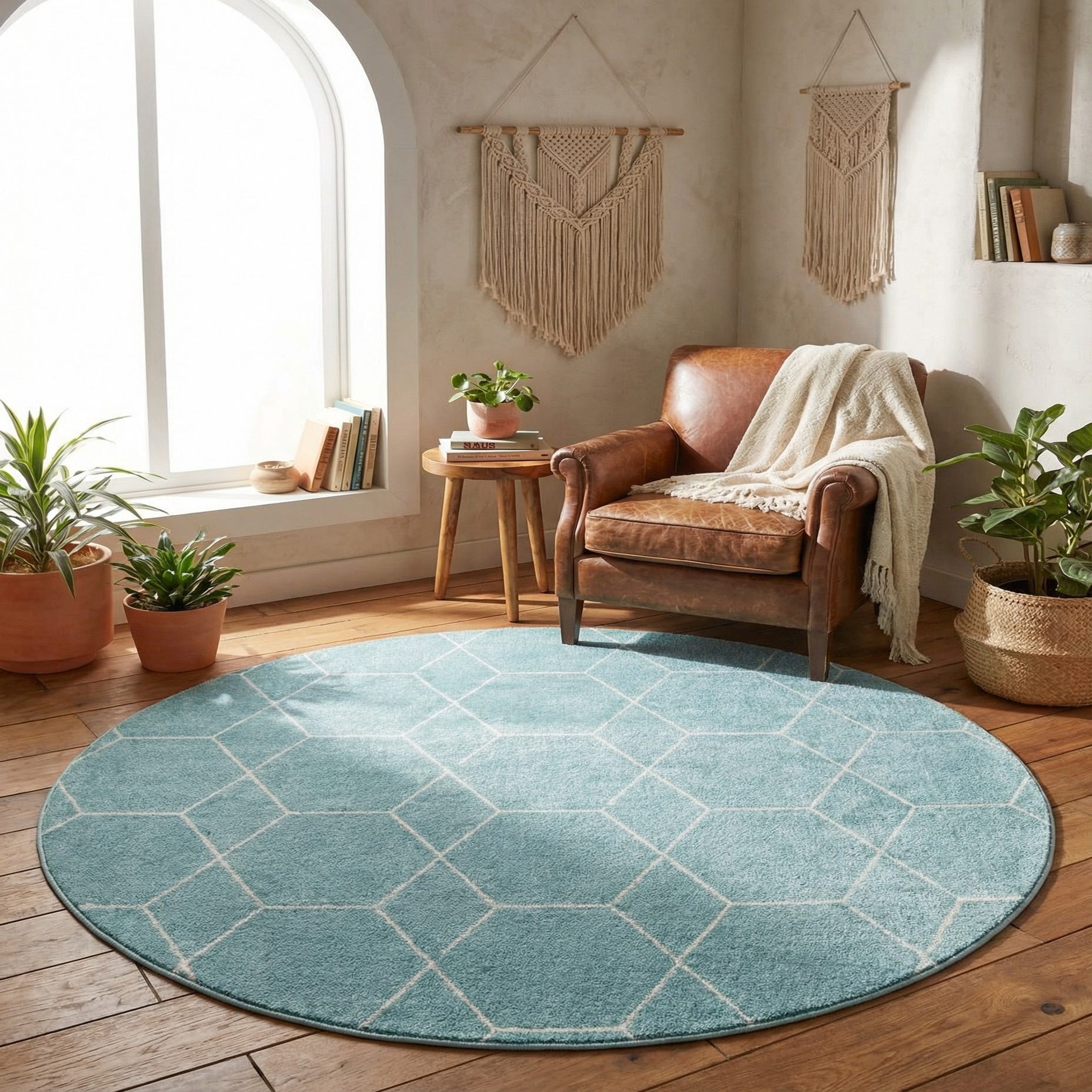 A crisp geometric lattice of interlocking hexagons traces the surface in ivory against a light blue ground, giving this round rug a clean, modern look with subtle dimensional interest. The pattern is orderly and contemporary, with the ivory lines providing a soft contrast that brightens the blue field without overpowering it. The round shape emphasizes the repeating geometry, creating a polished focal point that complements streamlined furnishings.
