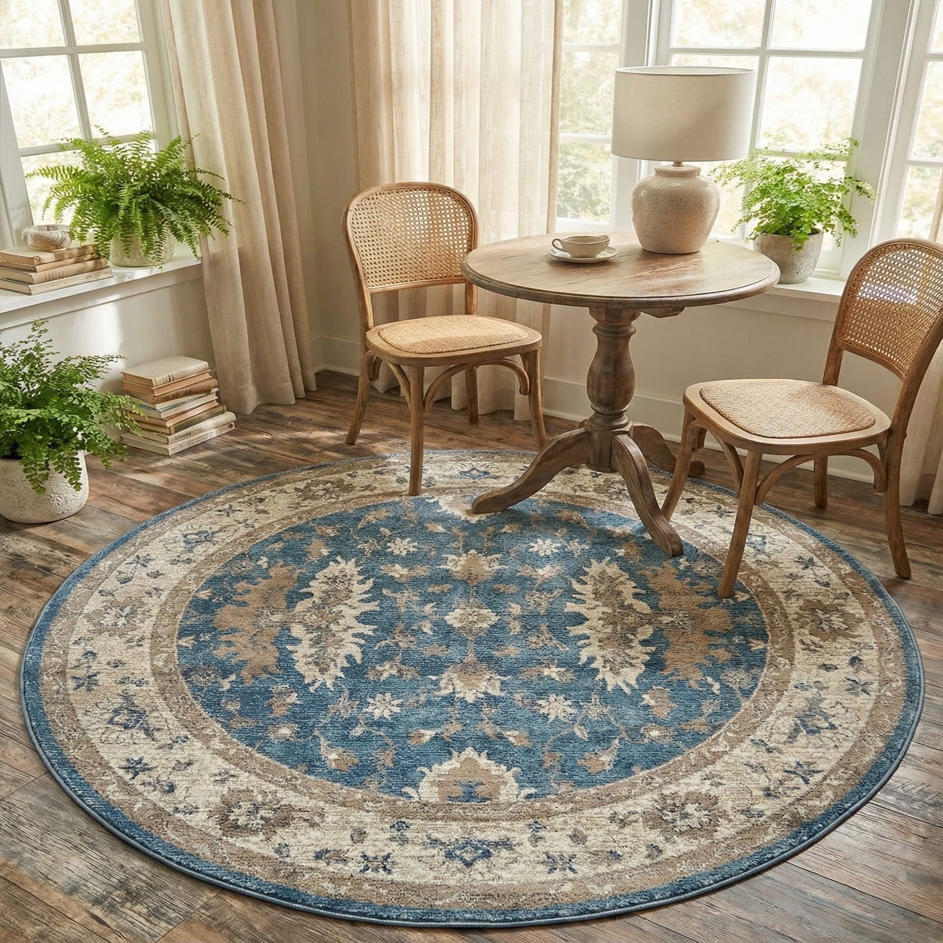 This rug works well under a round dining table, anchored beneath a small seating group, or centered in a bedroom to add a touch of calm color and pattern. It complements coastal, cottage, and transitional interiors—pair it with warm wood tones and neutral upholstery for a relaxed setting, or with white-painted furniture and soft linens to emphasize the light blue and ivory palette.