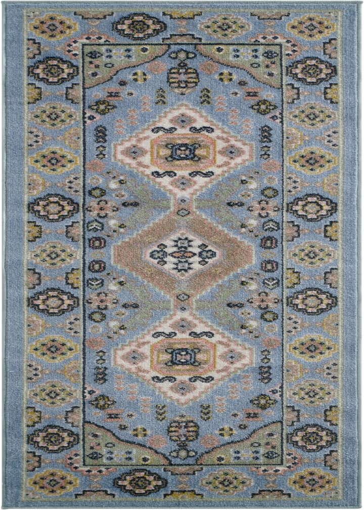 Primary color is Light Blue. Colors in this rug include: Light Blue, Ivory, Light Green, Pink, Yellow, Beige.