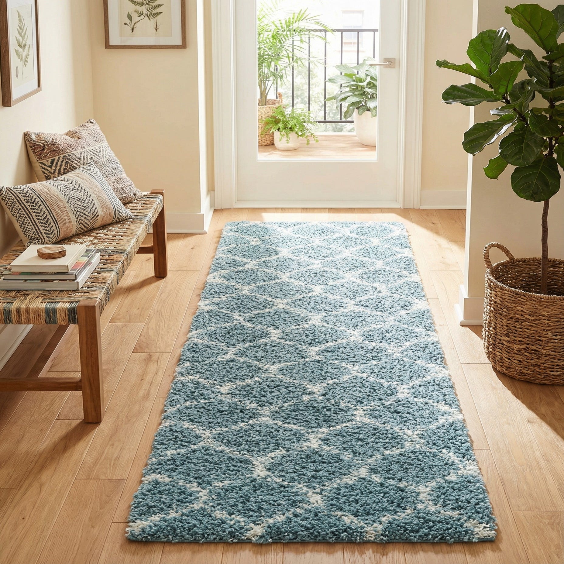 A 5 ft runner rug with a plush, high-low pile in light blue, featuring a modern white lattice pattern, ideal for hallways.