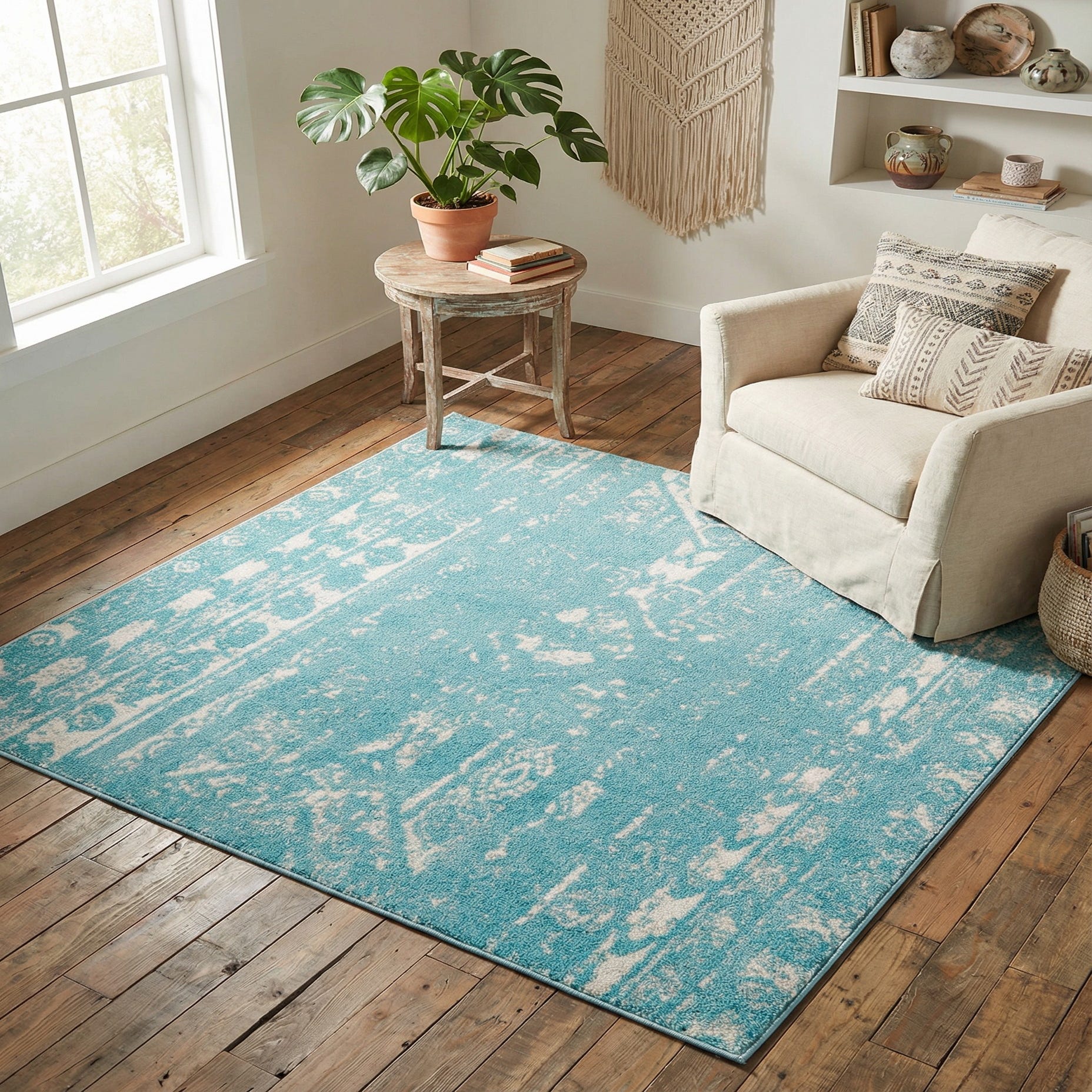 A soft, low?profile rug with a relaxed, vintage-inspired pattern, this square piece pairs a light blue background with ivory ornamental motifs arranged in horizontal bands and a subtle central medallion area. The design has a gently distressed look that blends traditional decorative elements—floral and geometric accents—with a washed finish, creating a casual, lived?in feel. Running your hand across the surface reveals a dense, smooth pile with a slight sheen from the synthetic fibers that keeps the pattern clear and defined.