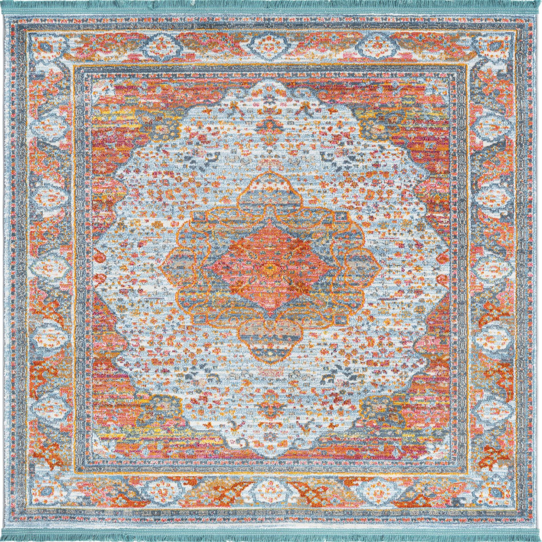A low-profile, machine-made piece crafted from 100% polypropylene, this rug features a central medallion set against a light blue ground with a soft, worn-in look. Warm orange and pink accents mingle with turquoise and ivory details across a field of scattered floral motifs and a traditional ornamental border. The surface has a smooth, slightly dense hand that feels comfortable underfoot, and a short fringe trim adds a subtle finishing touch at the ends.