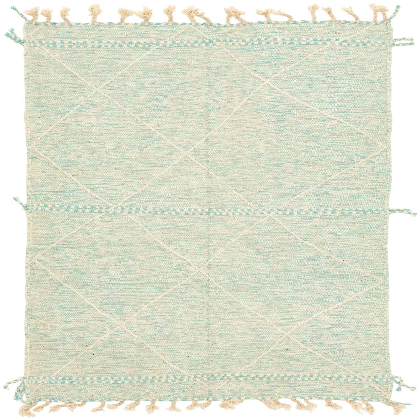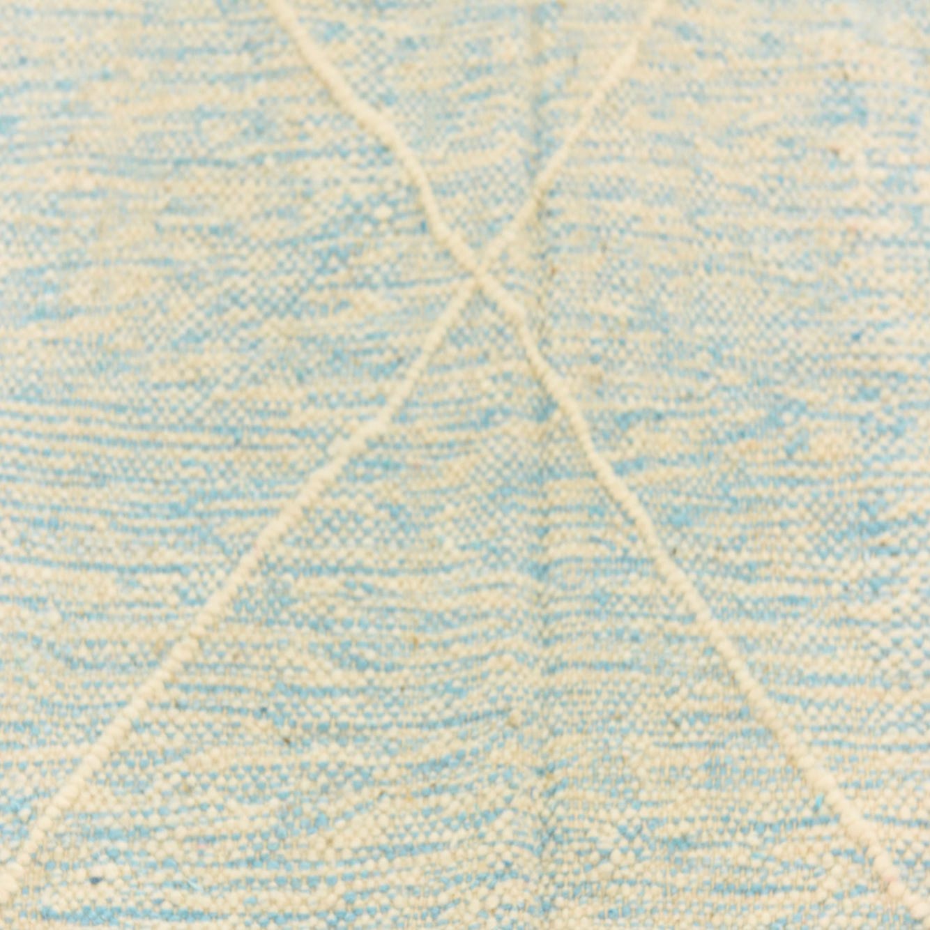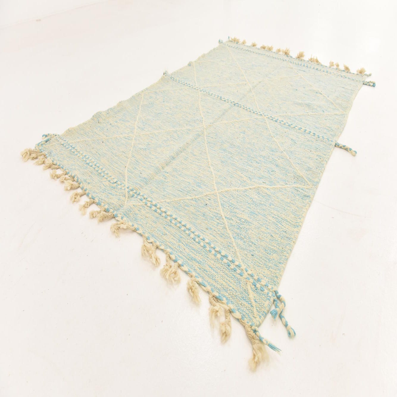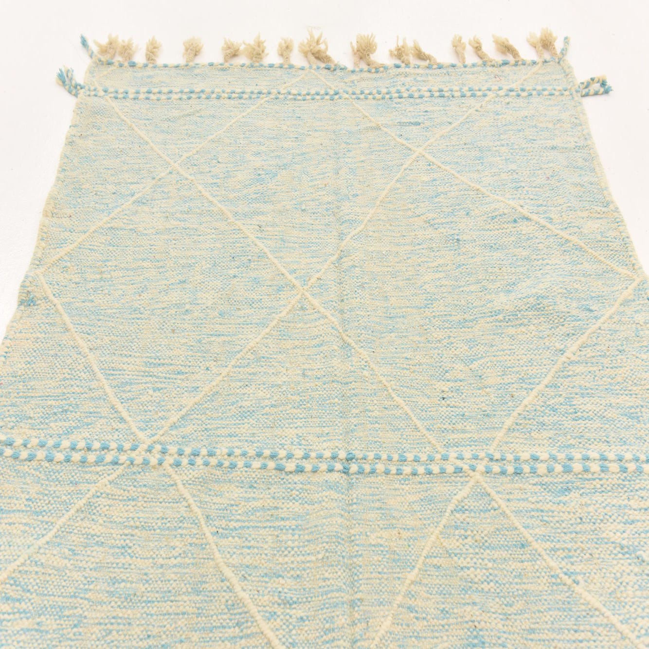 A 5x7 rectangular light blue and cream wool shag rug with a tribal diamond pattern and decorative tassels.