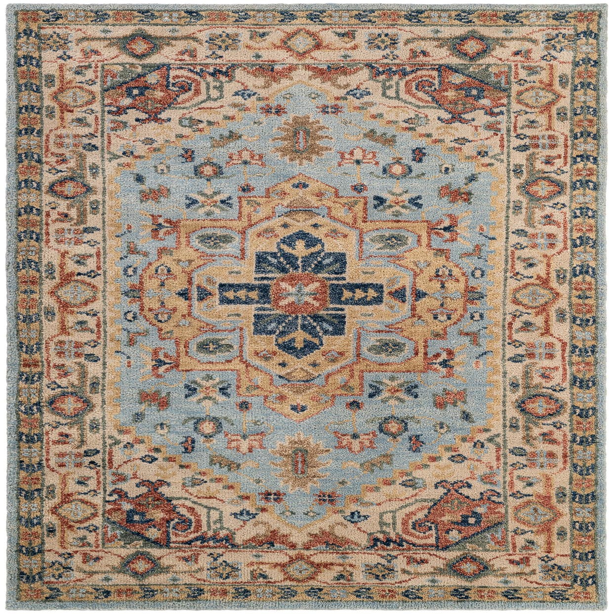 Primary color is Light Blue. Colors in this rug include: Light Blue, Navy Blue, Brown, Cream.
