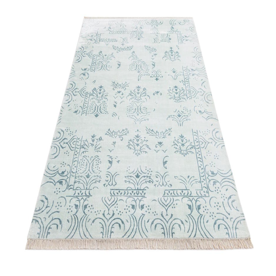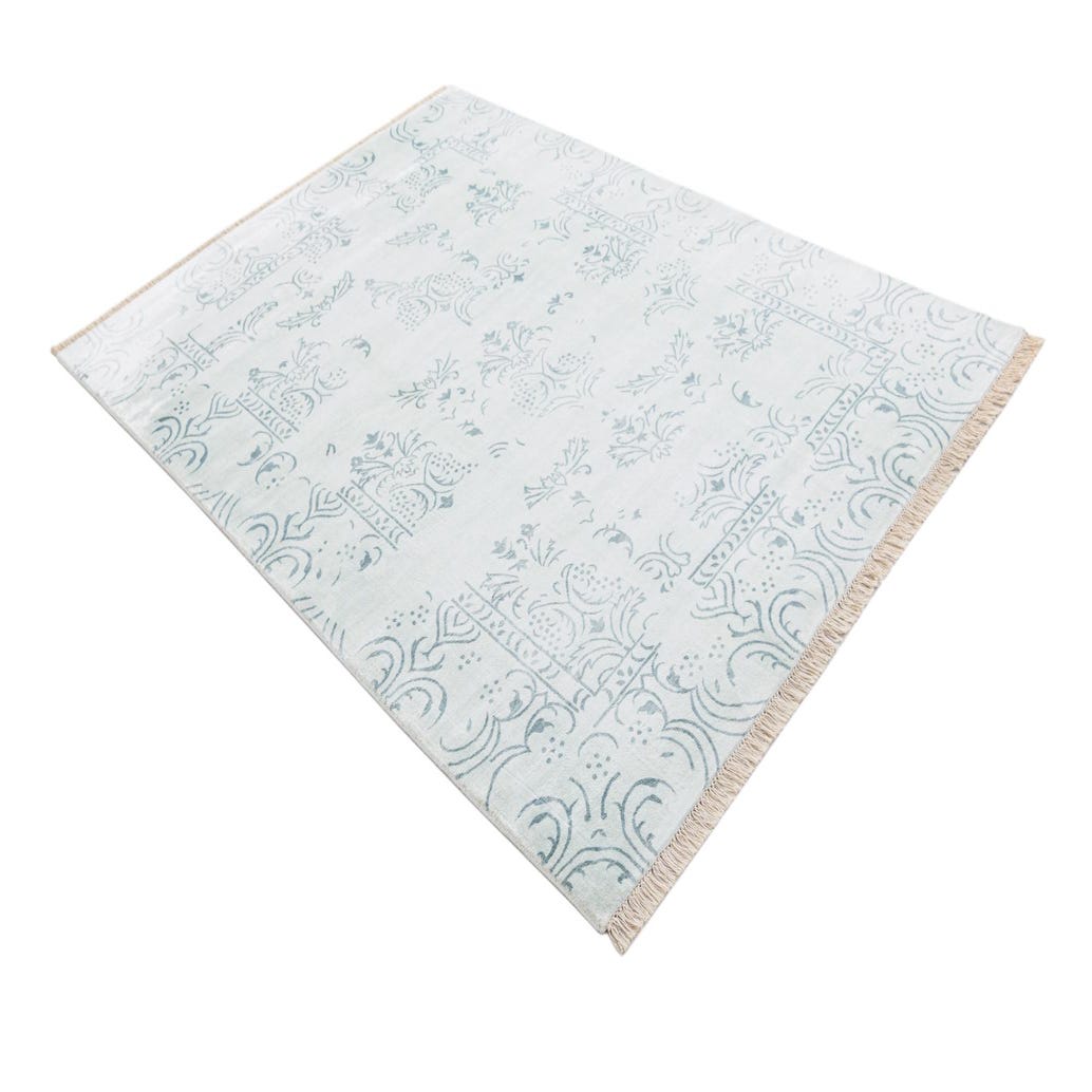 A 5x8 rectangular Darya rug with a light blue modern oriental pattern and fringe on a white background.