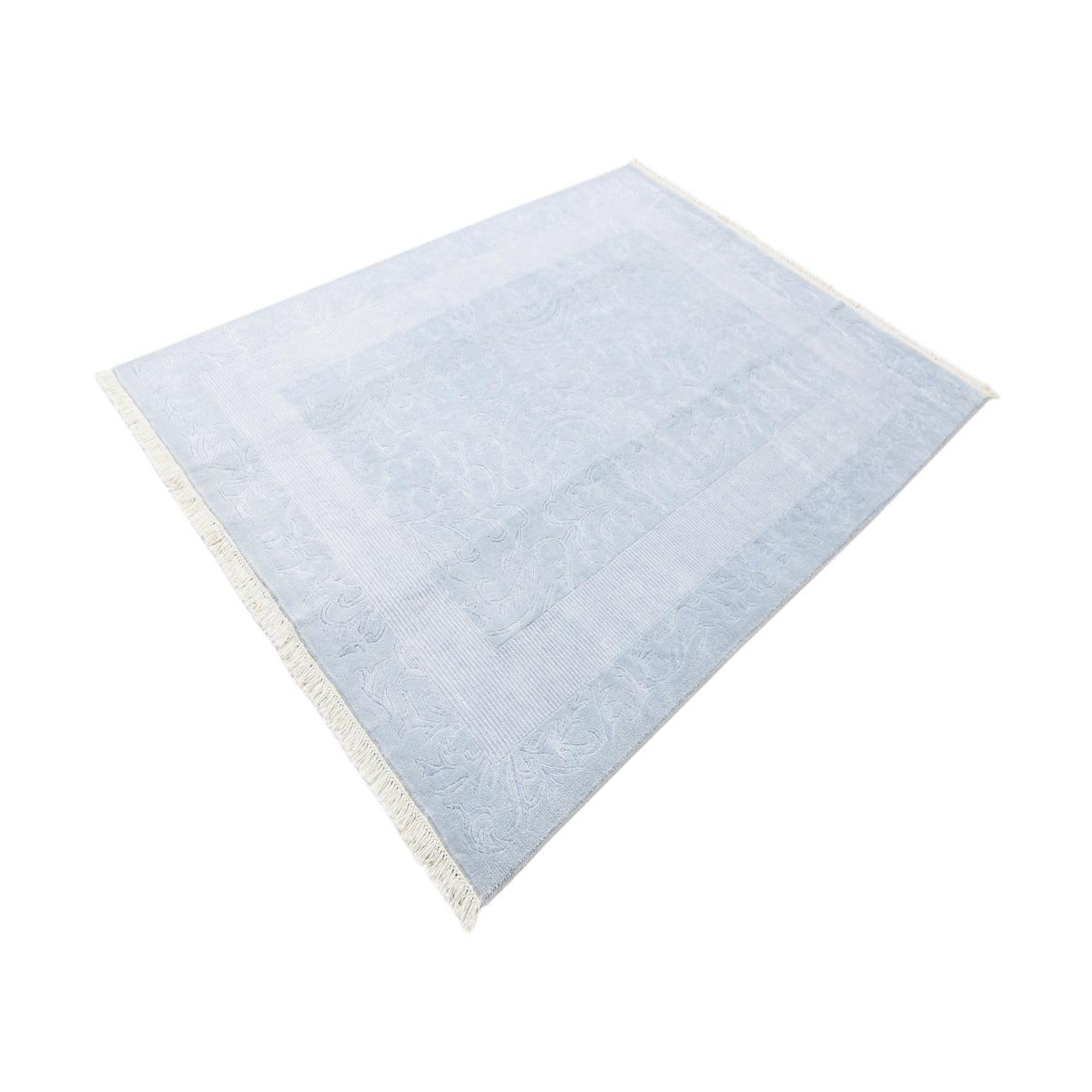 A 5x8 rectangular light blue wool rug with a subtle modern oriental pattern and fringe edges.