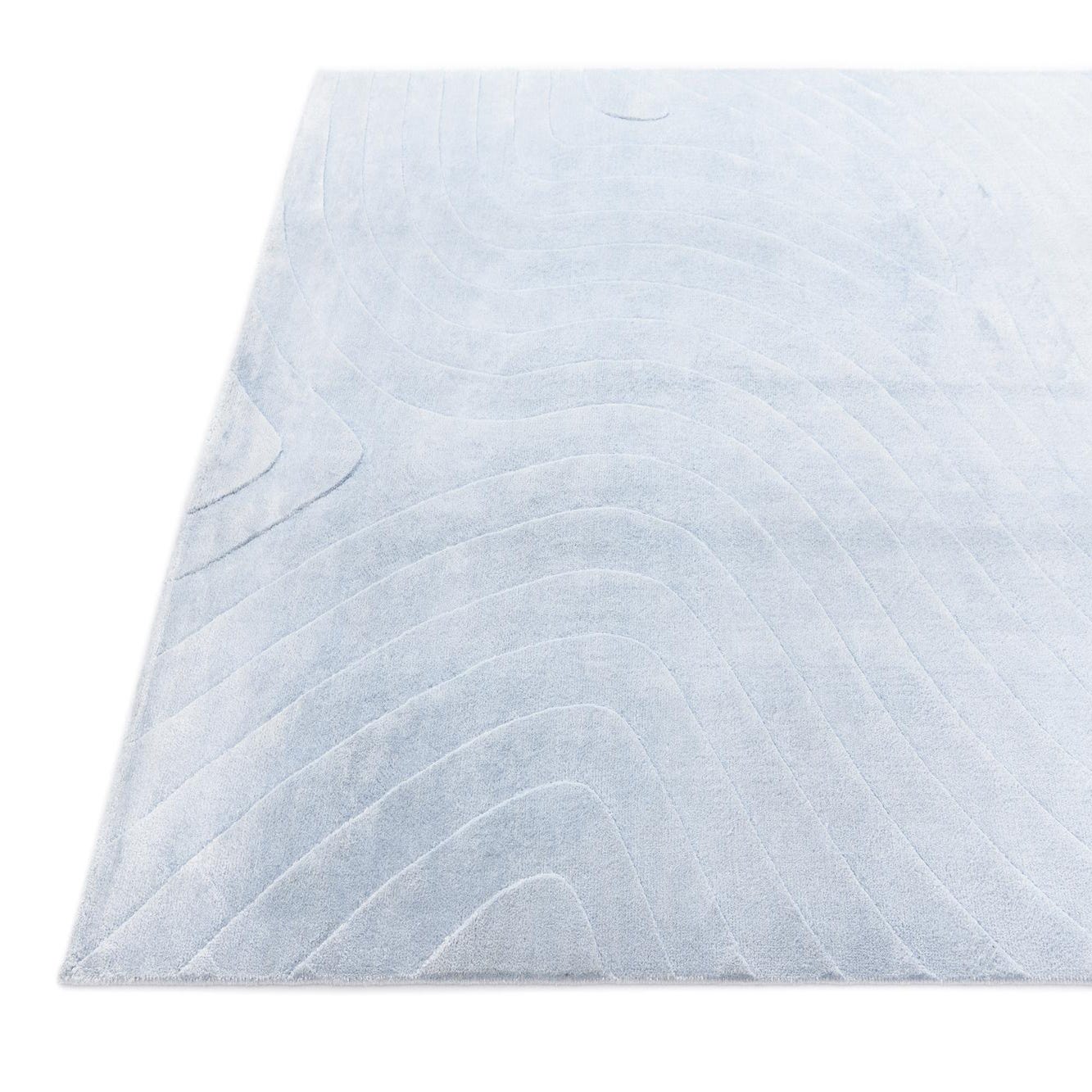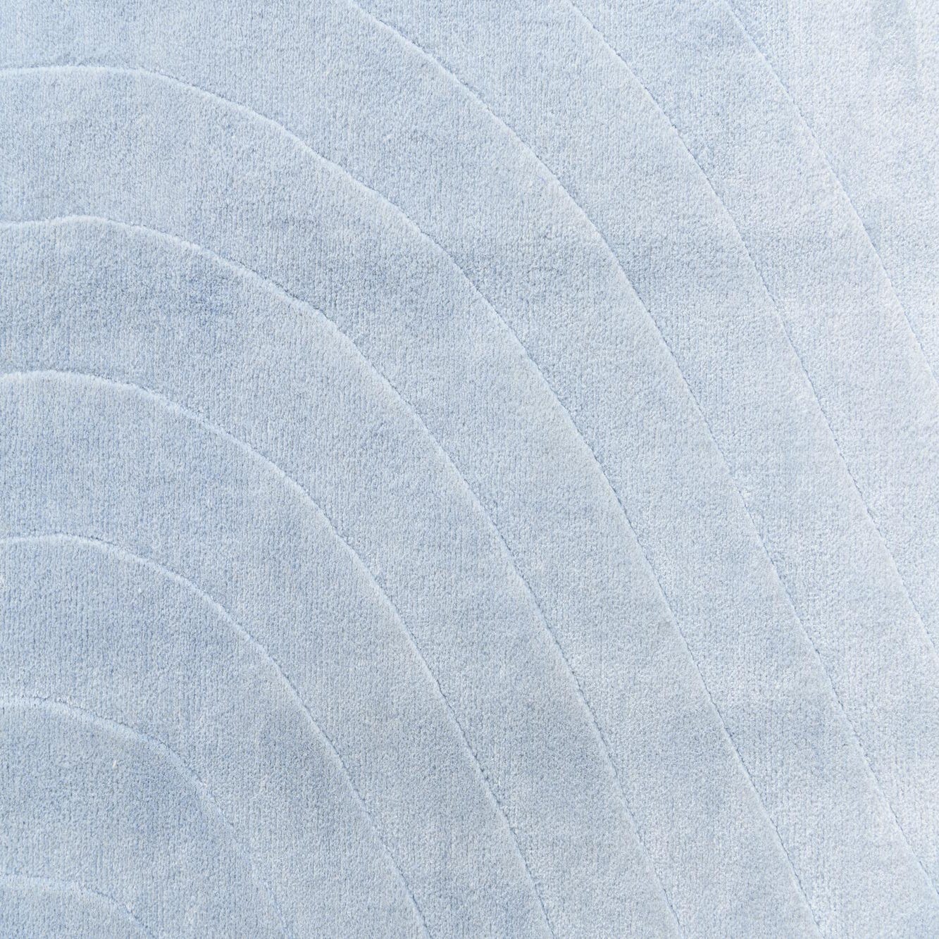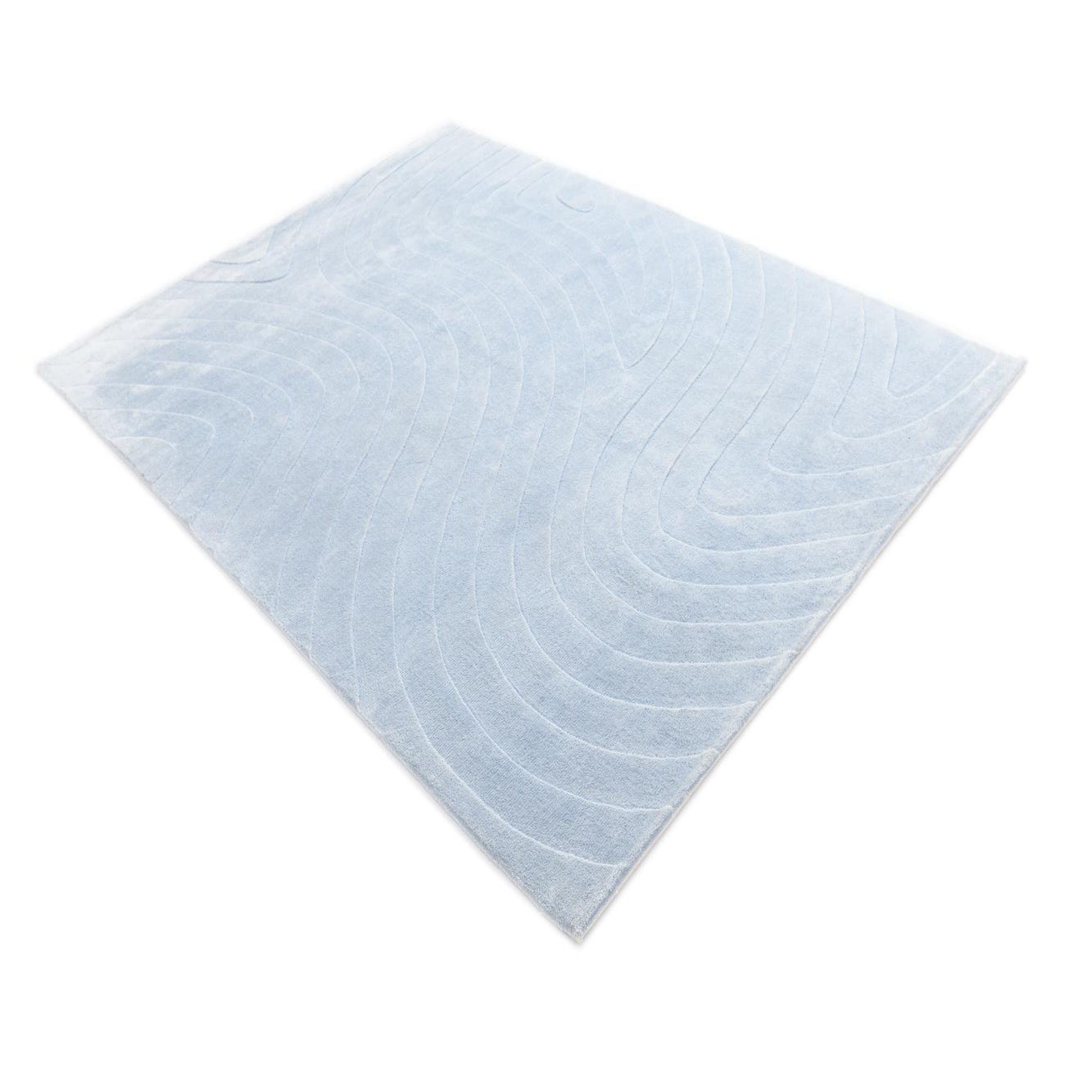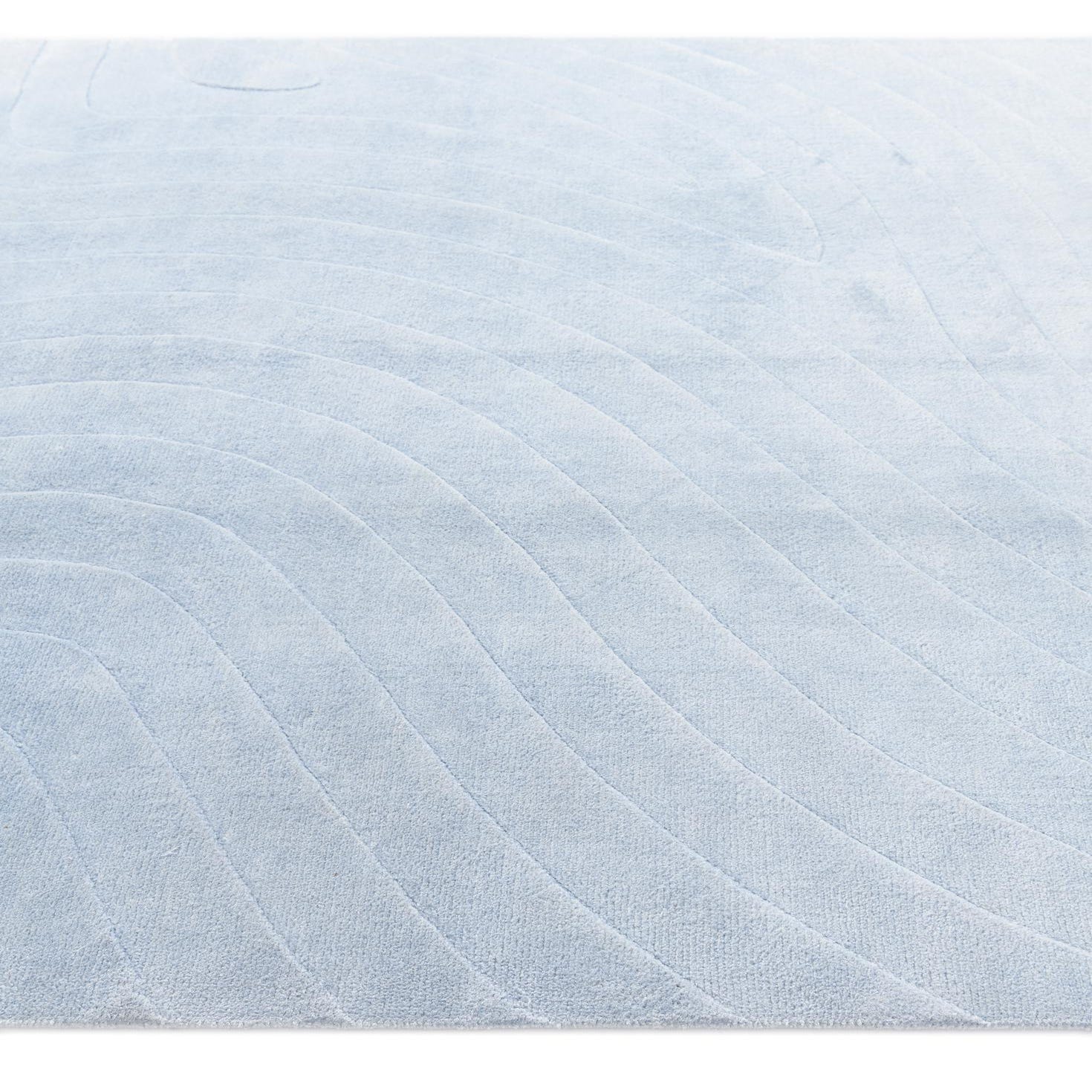 A 5x8 light blue rectangular wool rug with a subtle, raised modern abstract wave pattern, perfect for a living room.