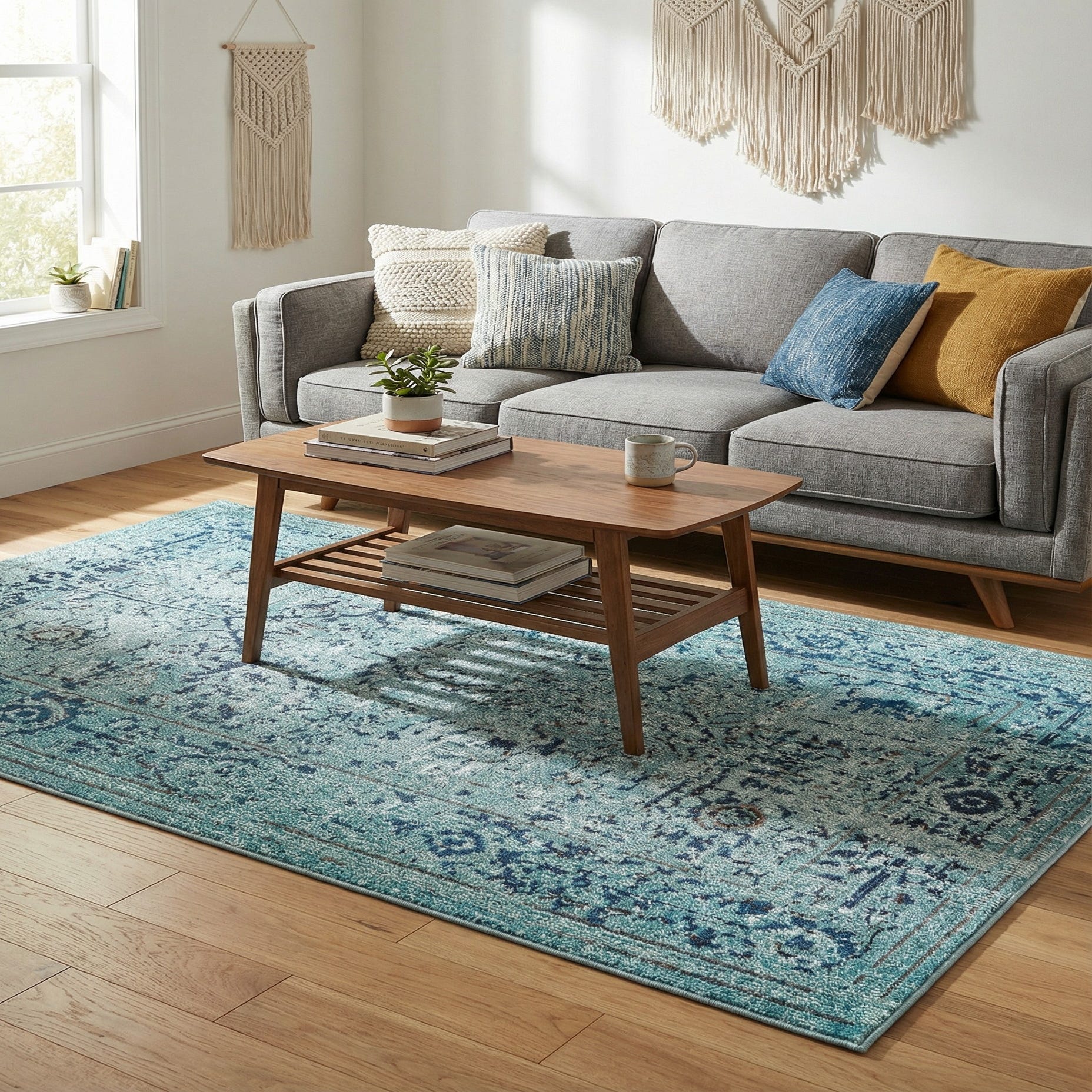 A vintage-inspired medallion pattern with a softly distressed finish gives this rug a timeless, lived-in character. The light blue field provides a cool, airy backdrop while layered accents of blue and navy blue trace the central medallion and ornate border; touches of ivory lift the pattern and add gentle contrast. Machine-made from 100% polypropylene, the rug has a low-profile pile with a slightly dense hand that feels comfortable underfoot and shows the design with clear definition.