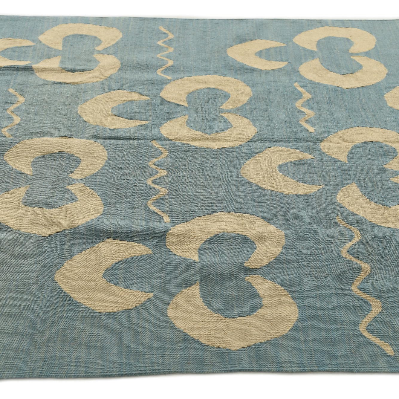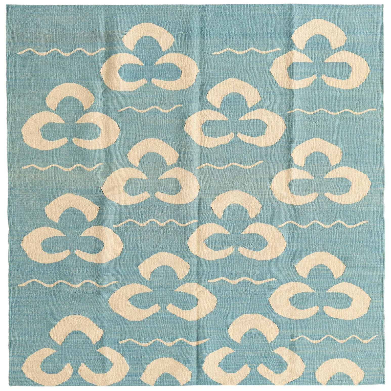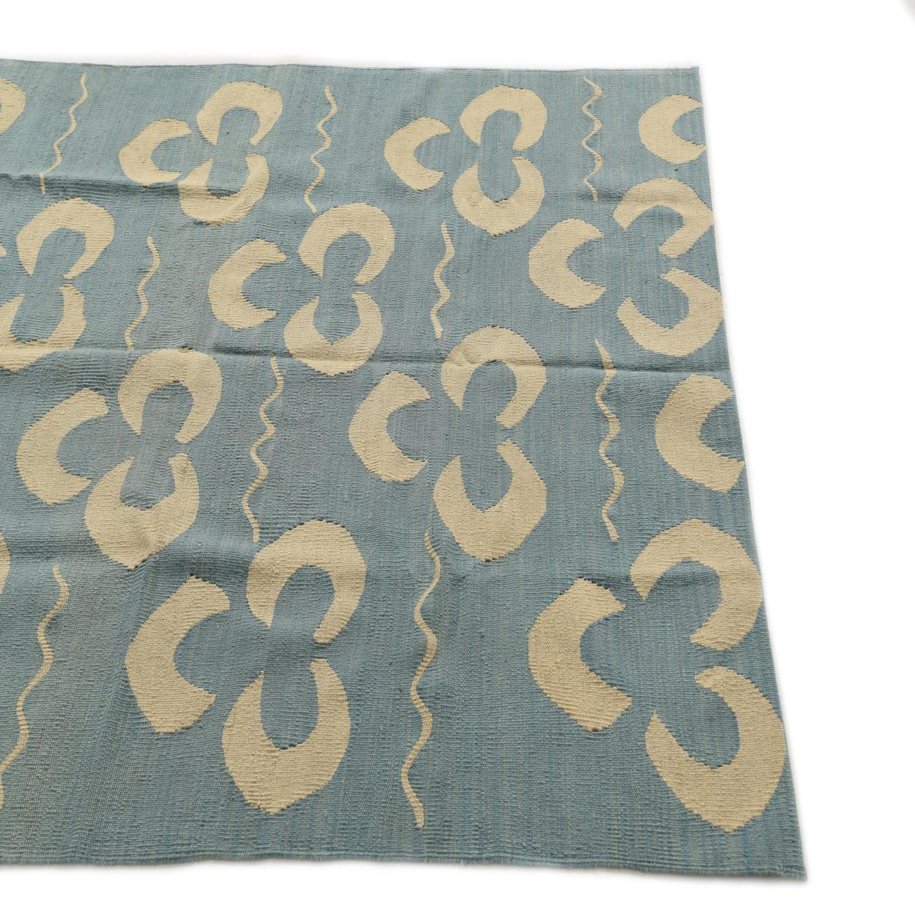A 5x8 rectangular light blue flatweave rug with a repeating pattern of cream-colored abstract tribal shapes and wavy lines.