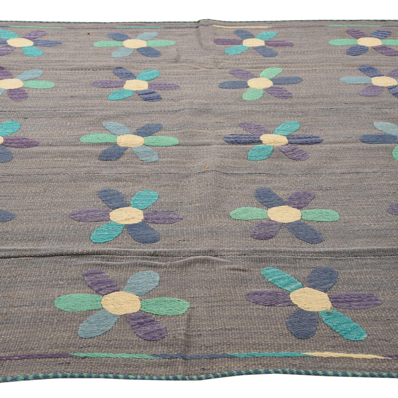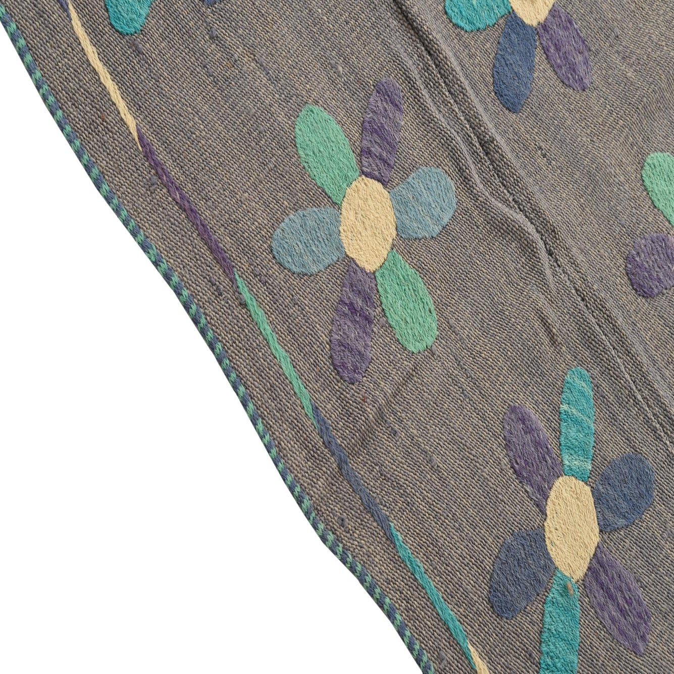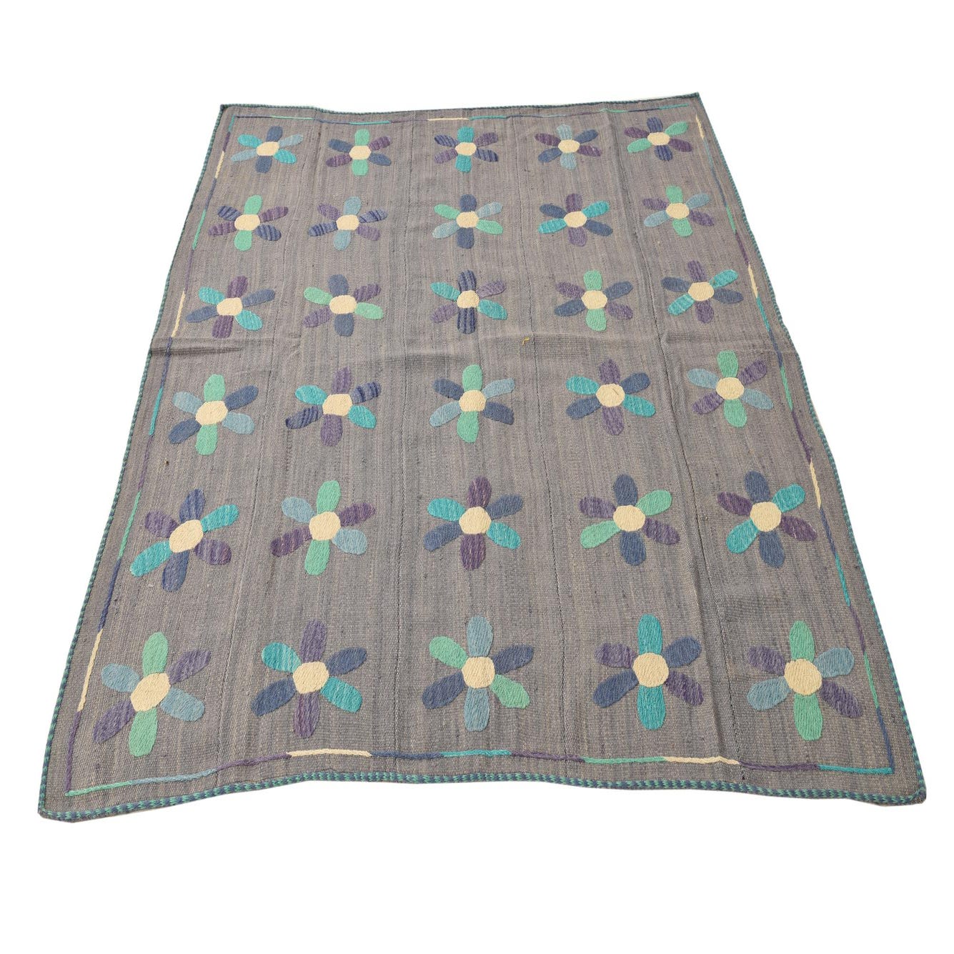 The Kilim Suzani collection presents a charming 5x8 hand-woven rug crafted from 100% wool, offering durability and a pleasant underfoot texture. This piece showcases a light blue background, gracefully adorned with a symmetrical pattern of floral motifs. The palette delicately interweaves hues of blue, ivory, turquoise, and purple, contributing to the rug's overall visual appeal.