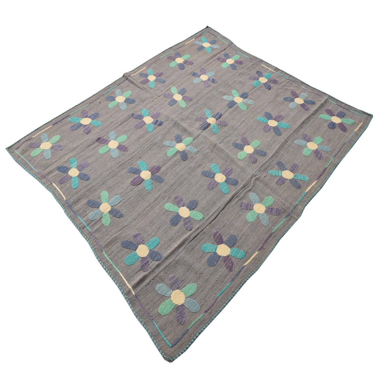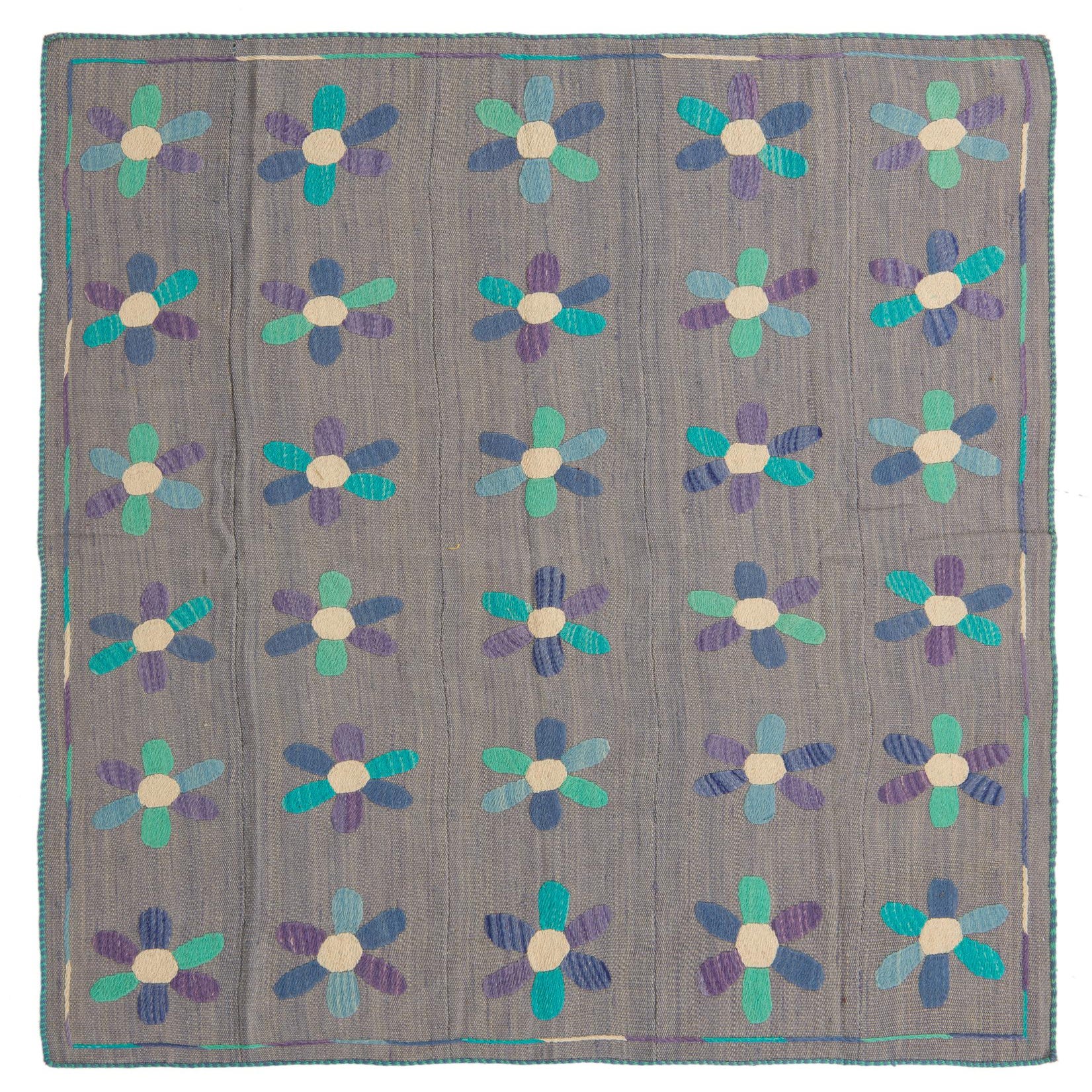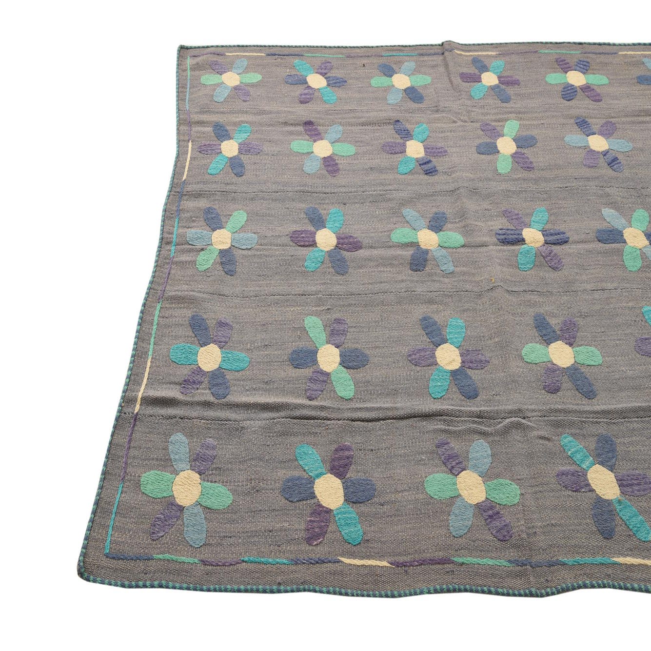 The Kilim Suzani collection presents a charming 5x8 hand-woven rug crafted from 100% wool, offering durability and a pleasant underfoot texture. This piece showcases a light blue background, gracefully adorned with a symmetrical pattern of floral motifs. The palette delicately interweaves hues of blue, ivory, turquoise, and purple, contributing to the rug's overall visual appeal.