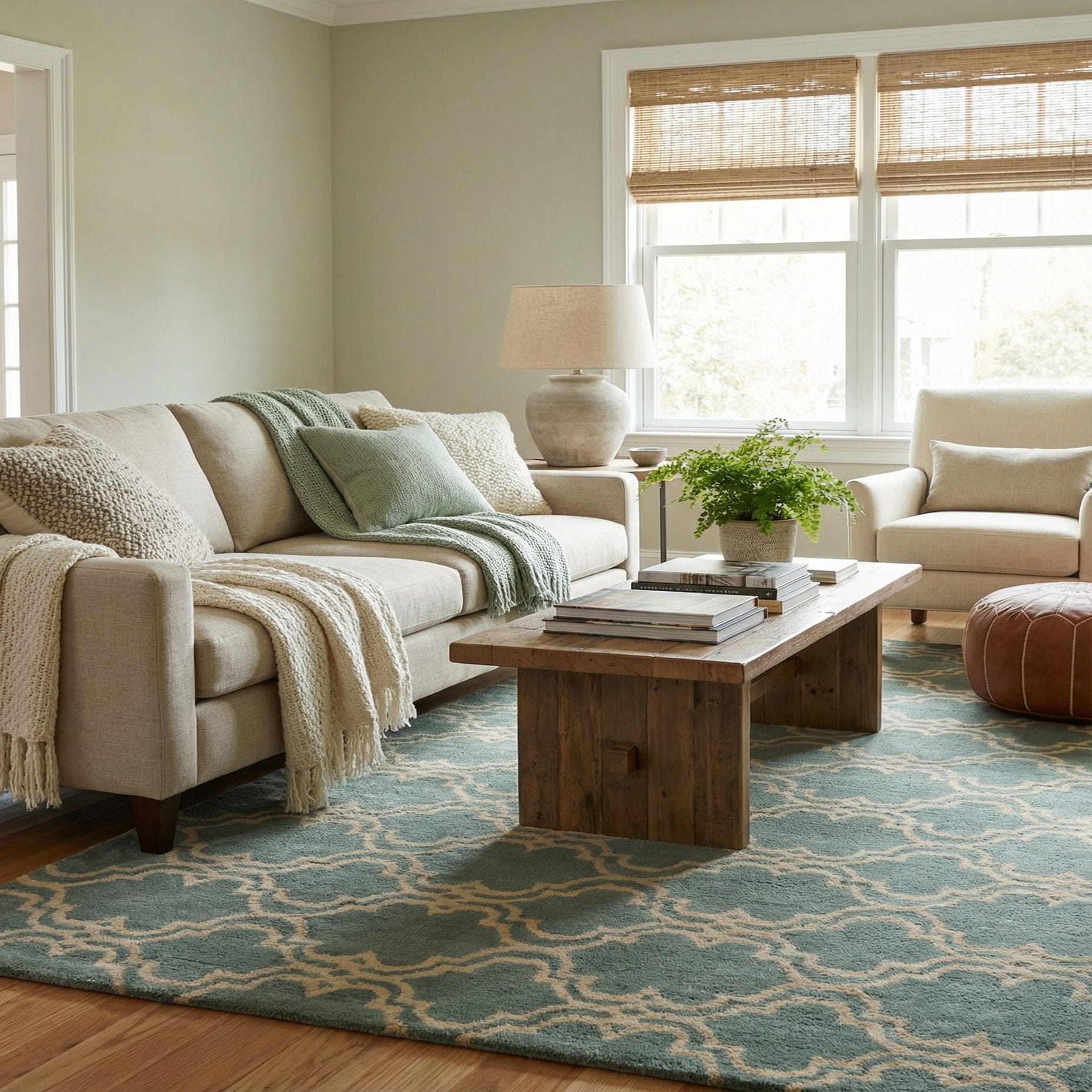 This rug pairs naturally with muted coastal and transitional interiors — think pale linens, painted furniture, and warm honey- or whitewashed woods — and also calms a modern living room or bedroom with neutral upholstery and brass or matte-black accents. It can anchor a seating area, sit beneath a bed to add a soft landing, or define a home office while keeping the palette airy and refined.