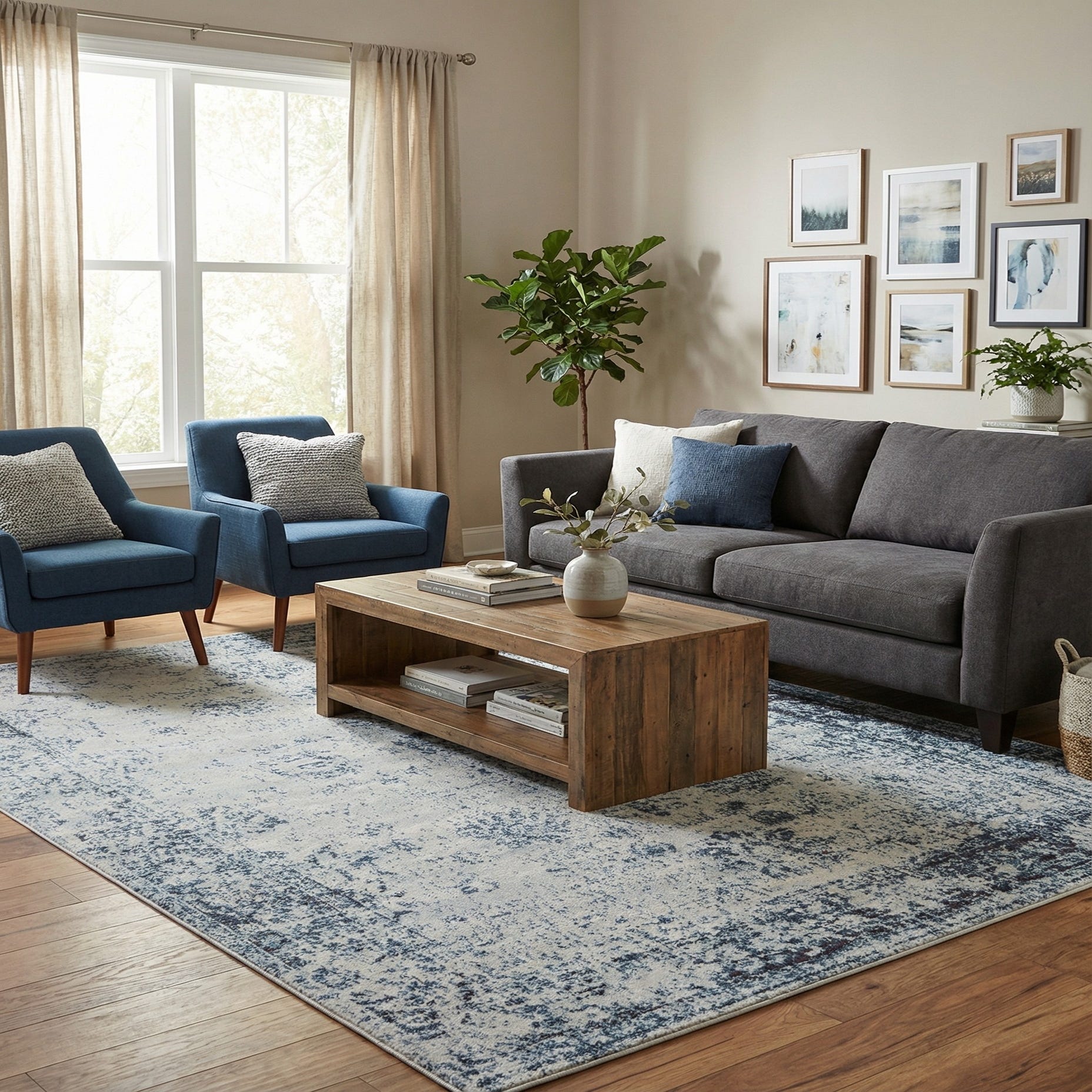 A 5x8 rectangular light blue and white bohemian area rug with a distressed medallion pattern, ideal for a living room.