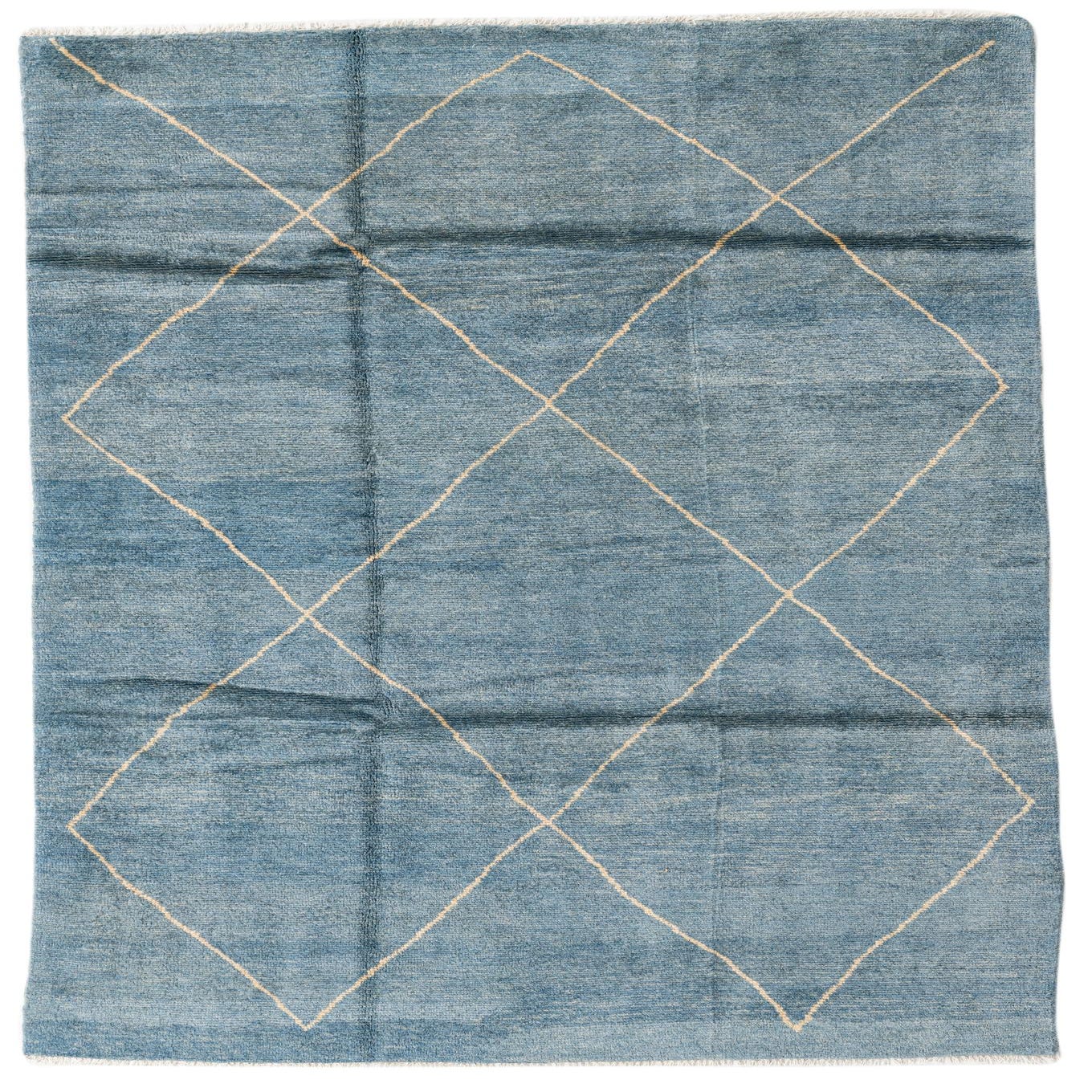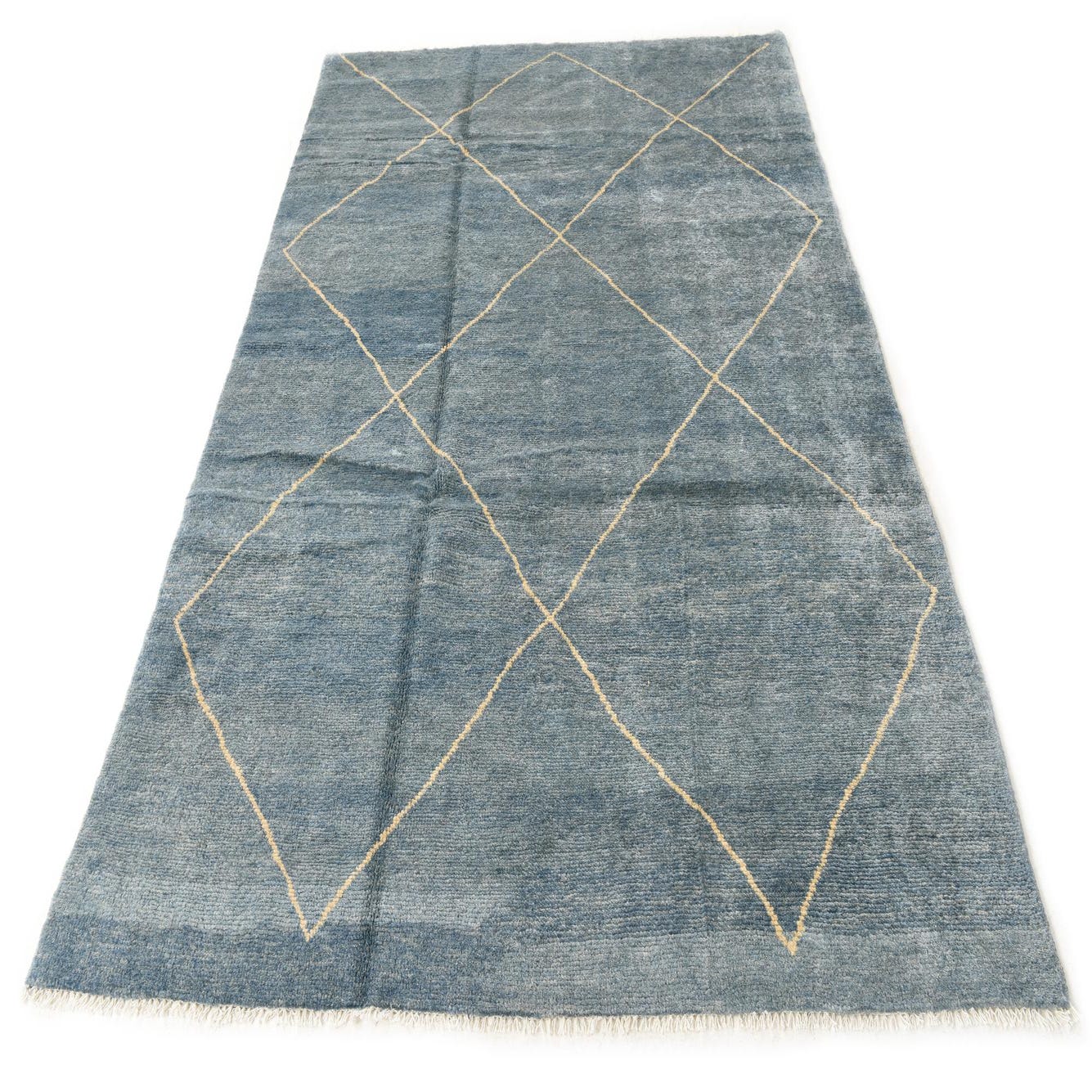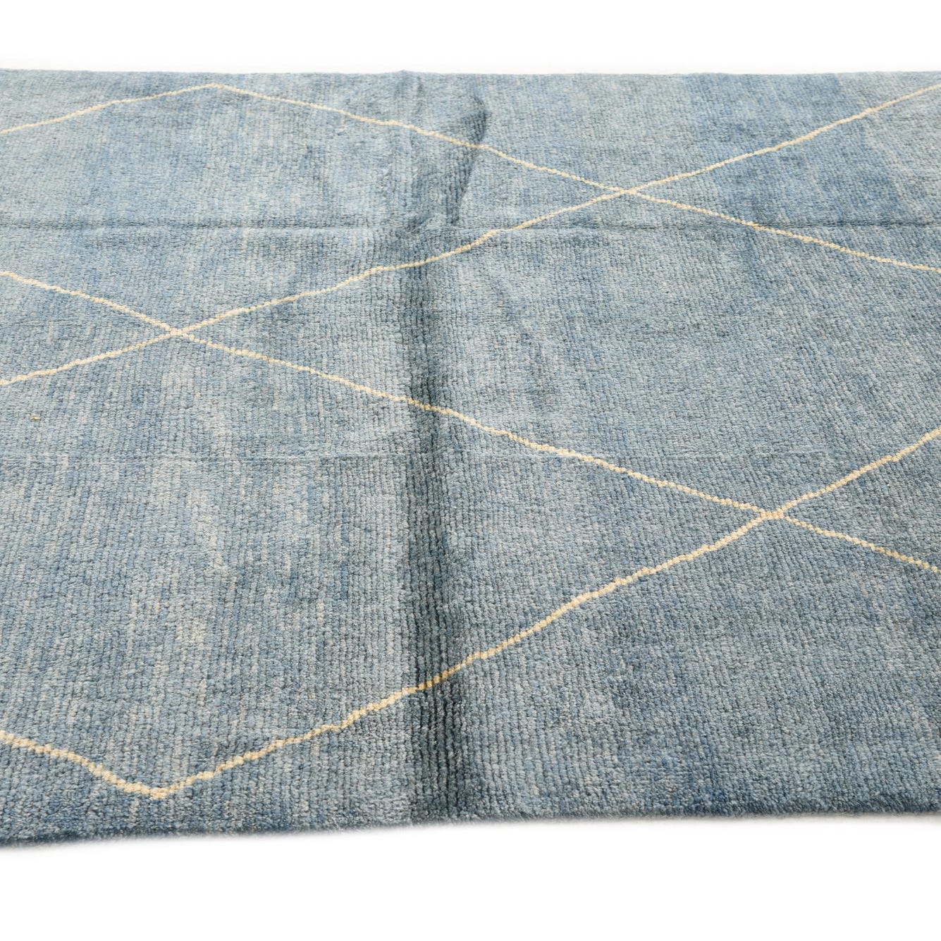 A 5x8 rectangular light blue Moroccan shag rug with a cream diamond tribal pattern, ideal for a living room.